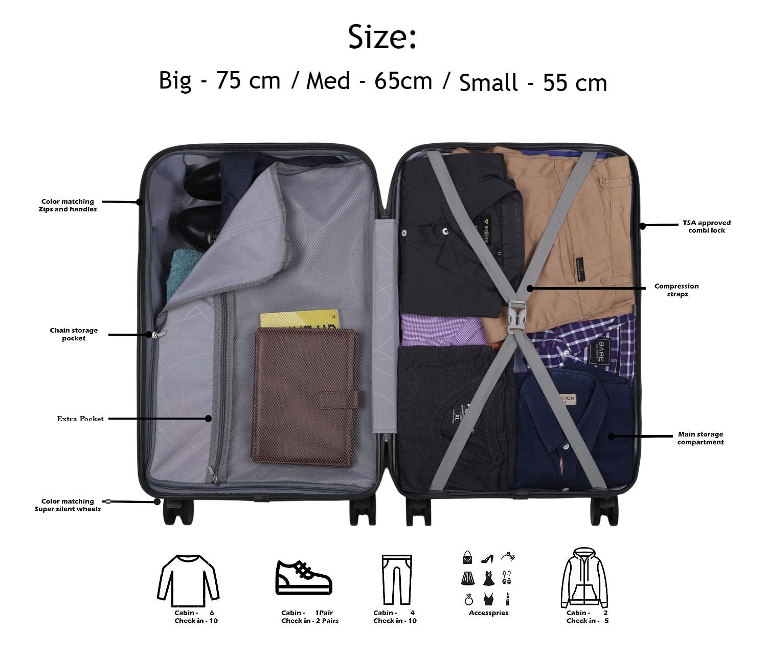 Extremely lightweight: Hard side luggage includes the following sizes: Medium: 65 cms (3.1 kgs) . Luggage is made from 100% Polypropylene which is very resilient, durable and extra lightweight.