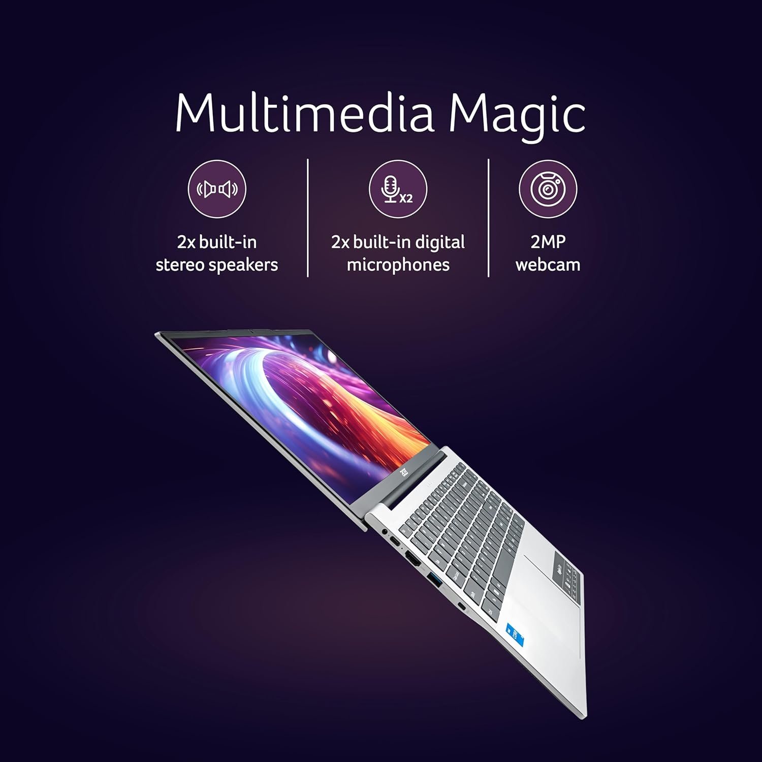 Say goodbye to awkward silences with dual stereo speakers, dual digital microphones, and a 2MP webcam perfect for virtual hangouts and conference calls