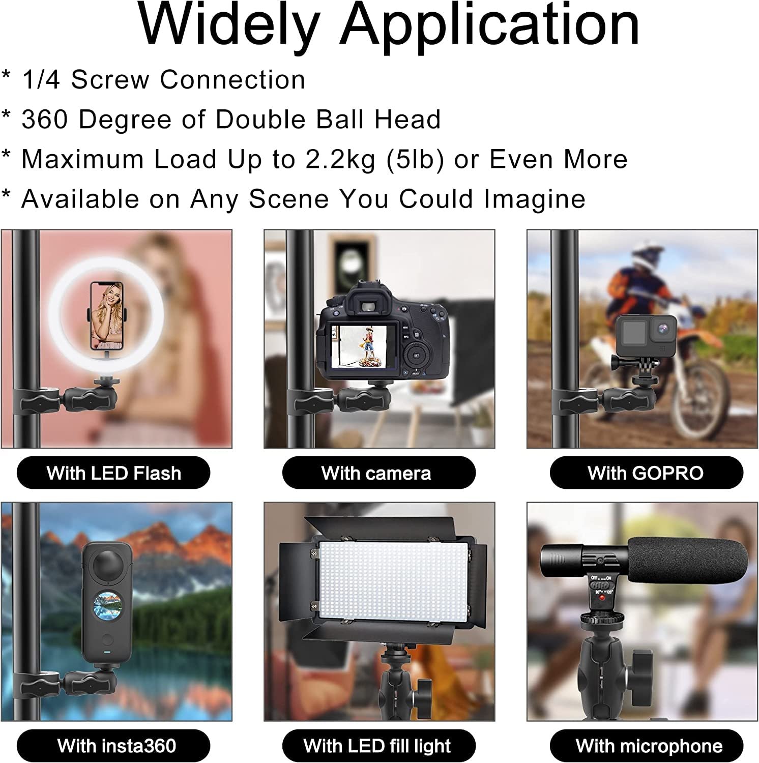【Wide Goods to Use】 You could fix your 1/4″-20 electronic products,accessories or tools with our super clamp like DSLR camera Sony Nikon Canon Kodak Panasonic, sport cameras GoPro HERO 11 10 9 8 7 6 5 4 3 AKASO Insta360 DJI,external screen monitor led flash light fill lamp and so on.