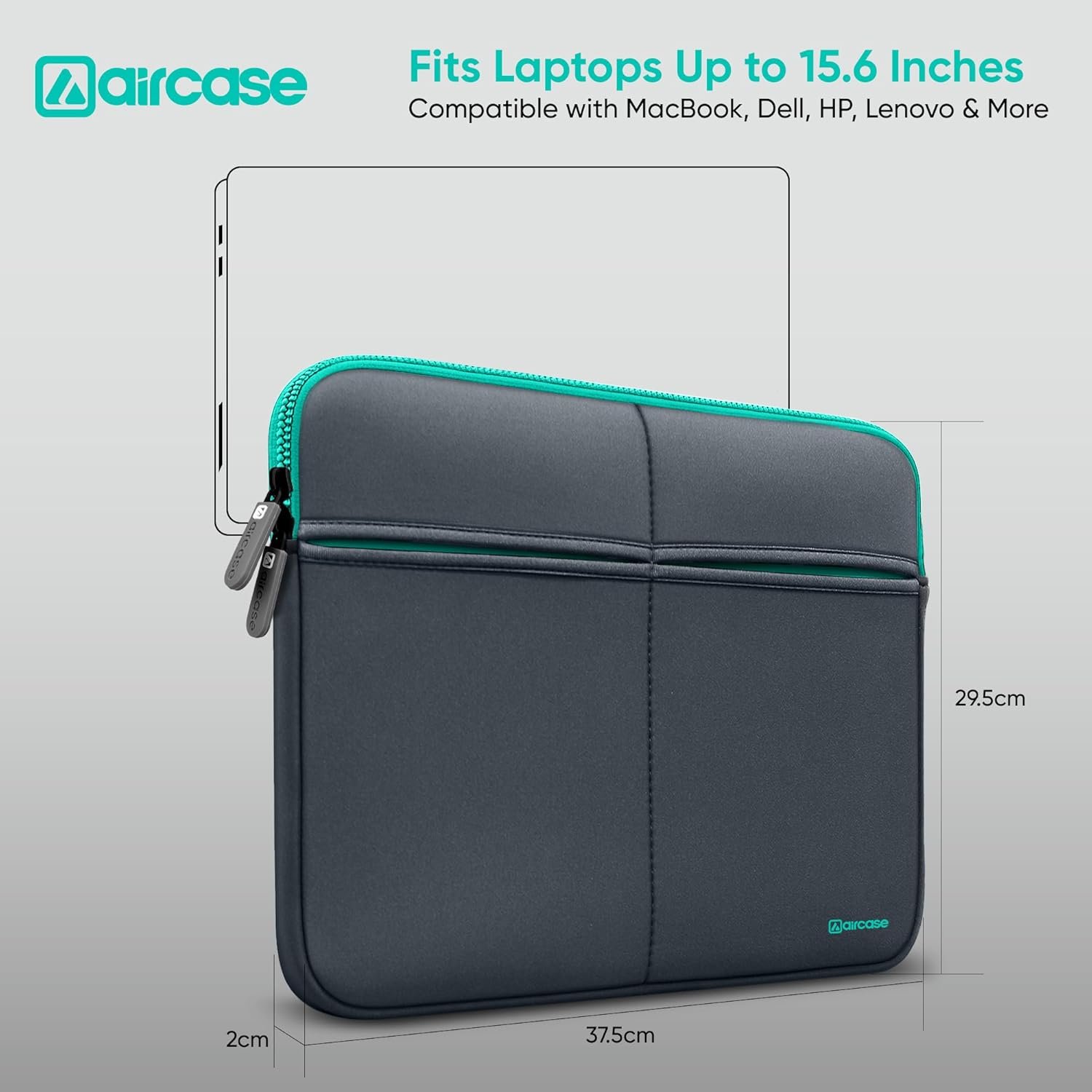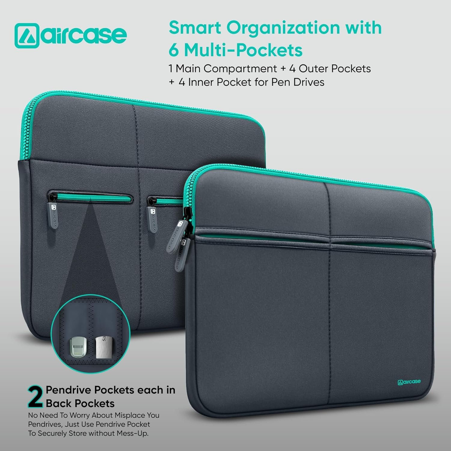 AirCase Laptop Sleeve available is front and back 2-pocket for keeping your charger, USB cables, headphone, powerbank and other accessories with laptop.