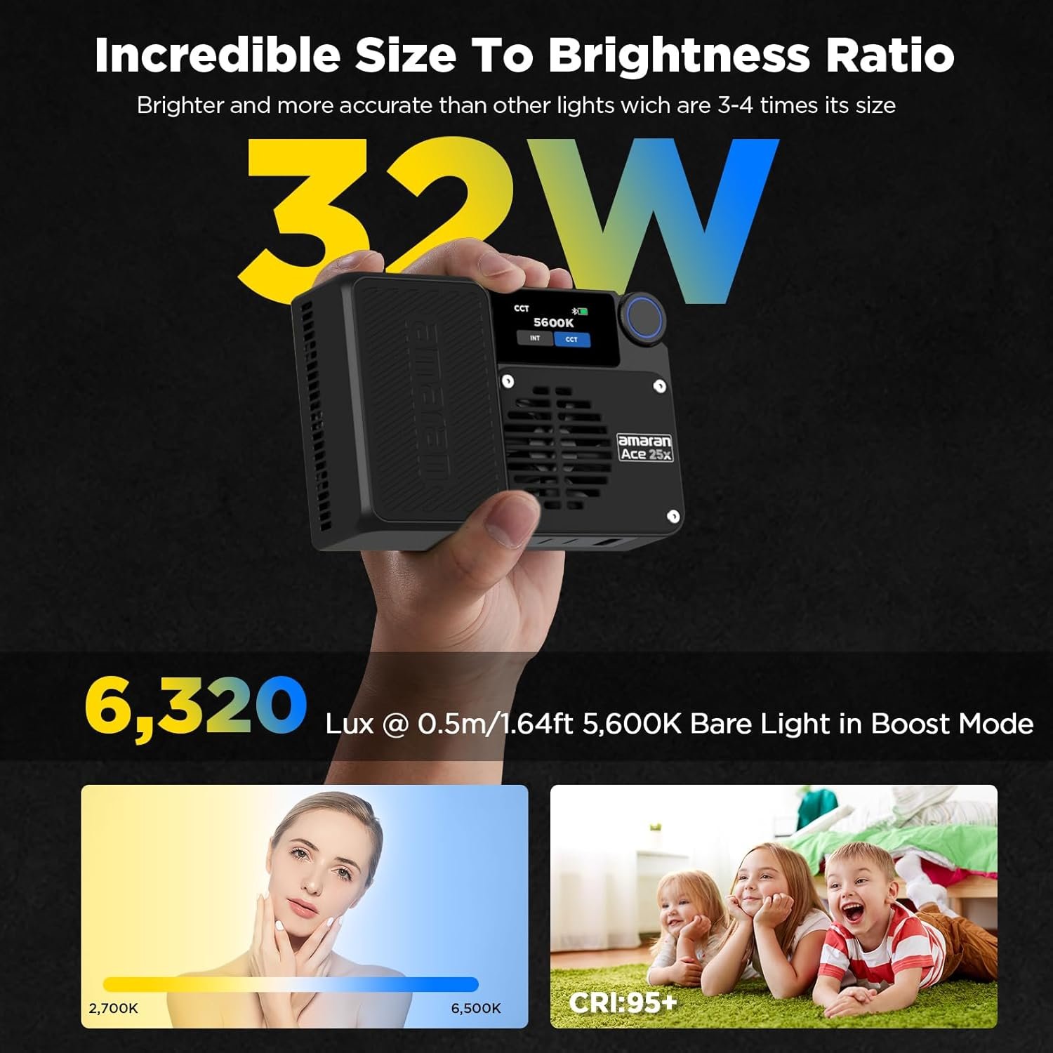 Versatile Bi-Color Lighting: The amaran Ace 25x offers a bi-color range of 2700K to 6500K, allowing you to adjust the color temperature to match various lighting environments for precise control over your scene’s mood.
