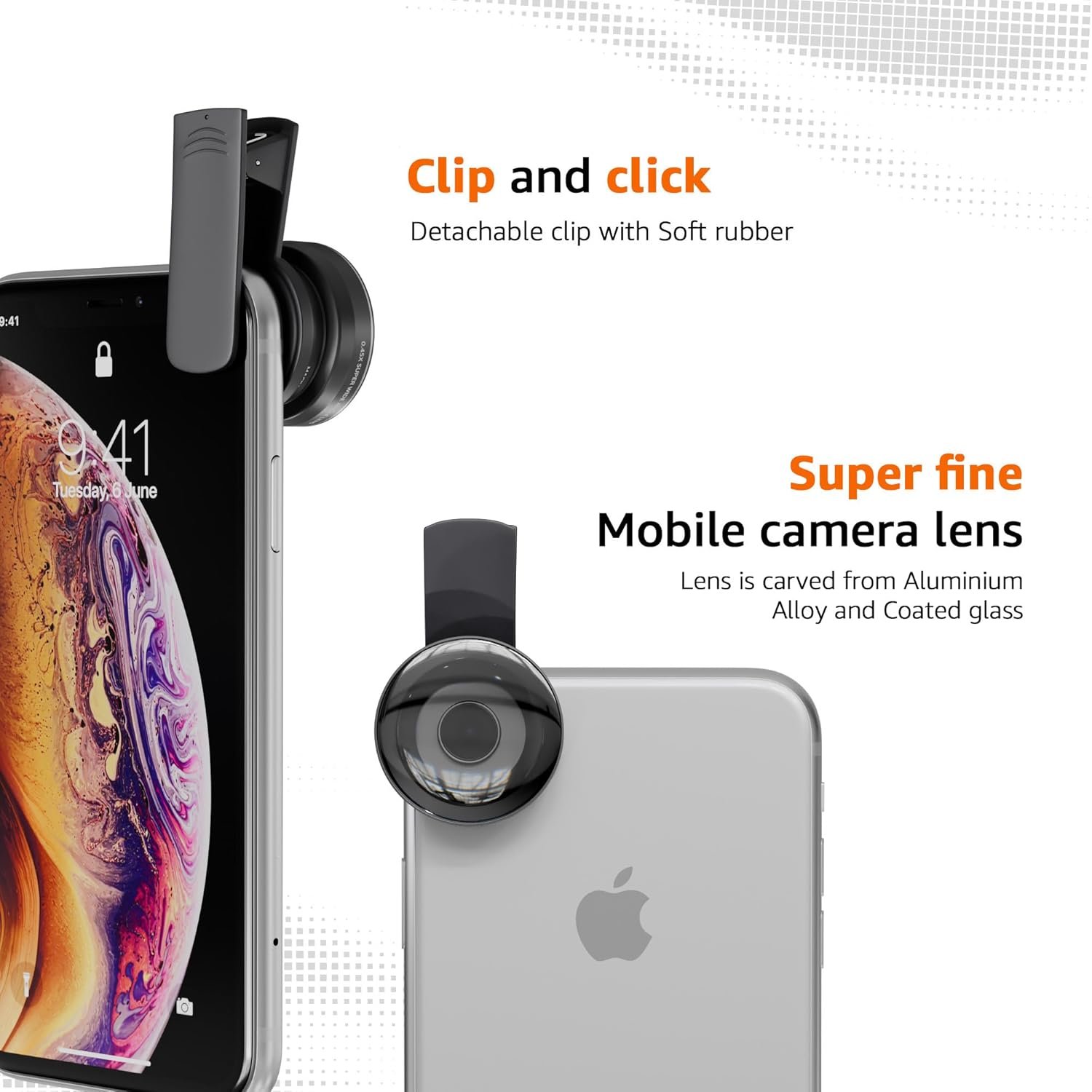 Unleash your photography potential with the Amazon Basics 2-in-1 Clip On Camera Lens Kit. This kit comprises a 0.45X Wide Lens and 15x Macro lens, enabling you to click landscapes and group photos, as well as macro shots of flowers and insects. The camera lens comes with a detachable clip that is easy to clip on to the smart phone. Made from premium quality aluminium alloy, the lens is durable and easy to clean and maintain.