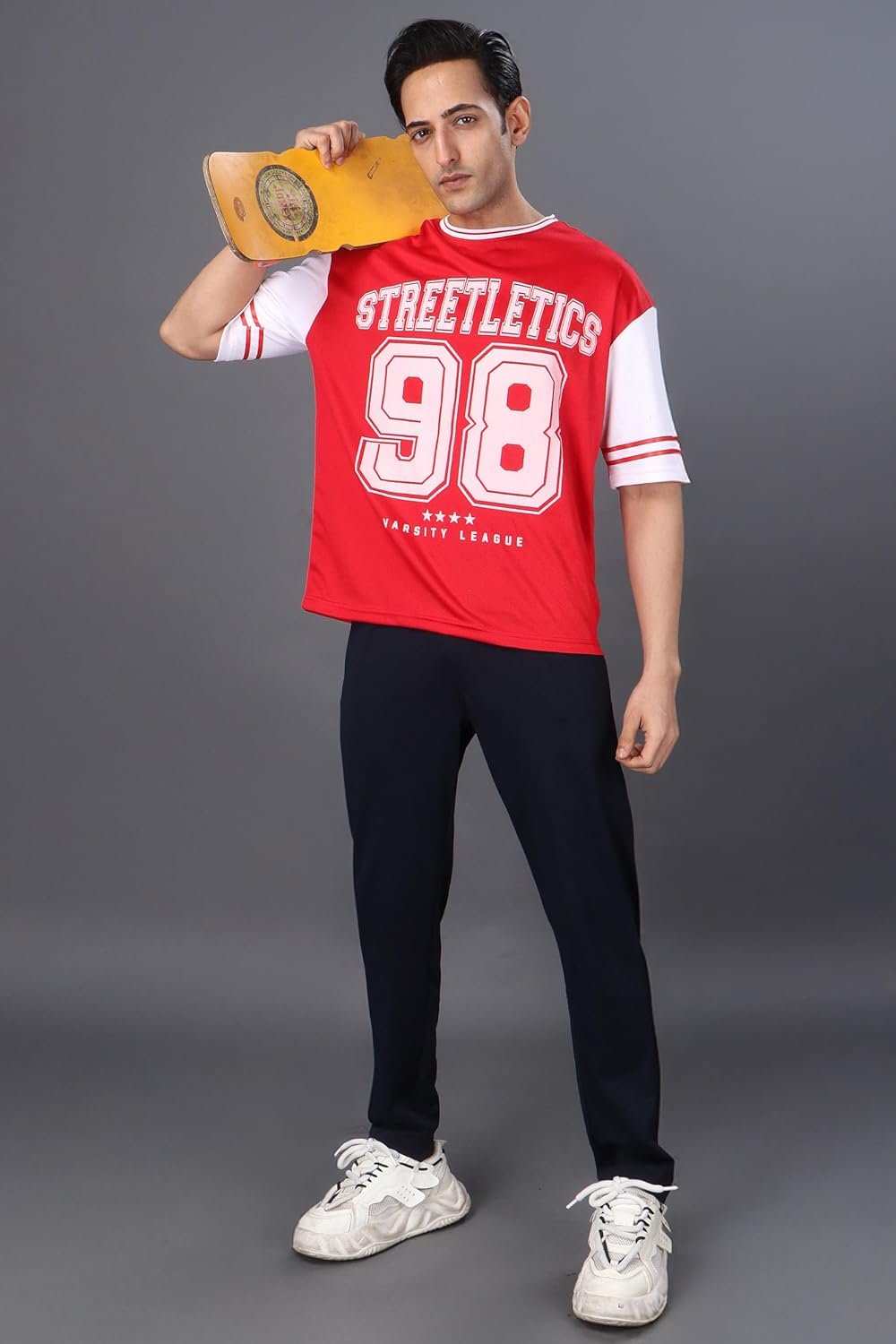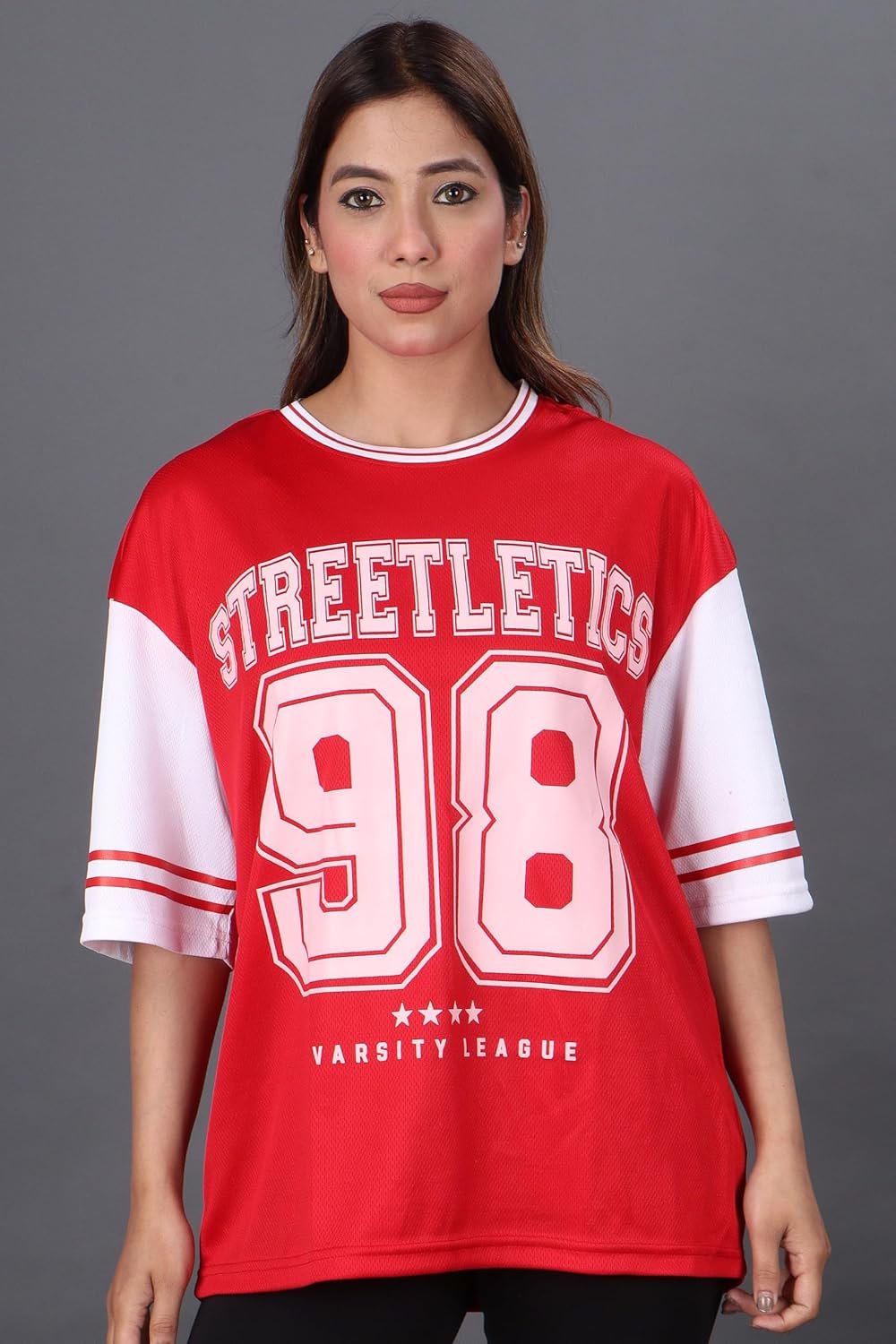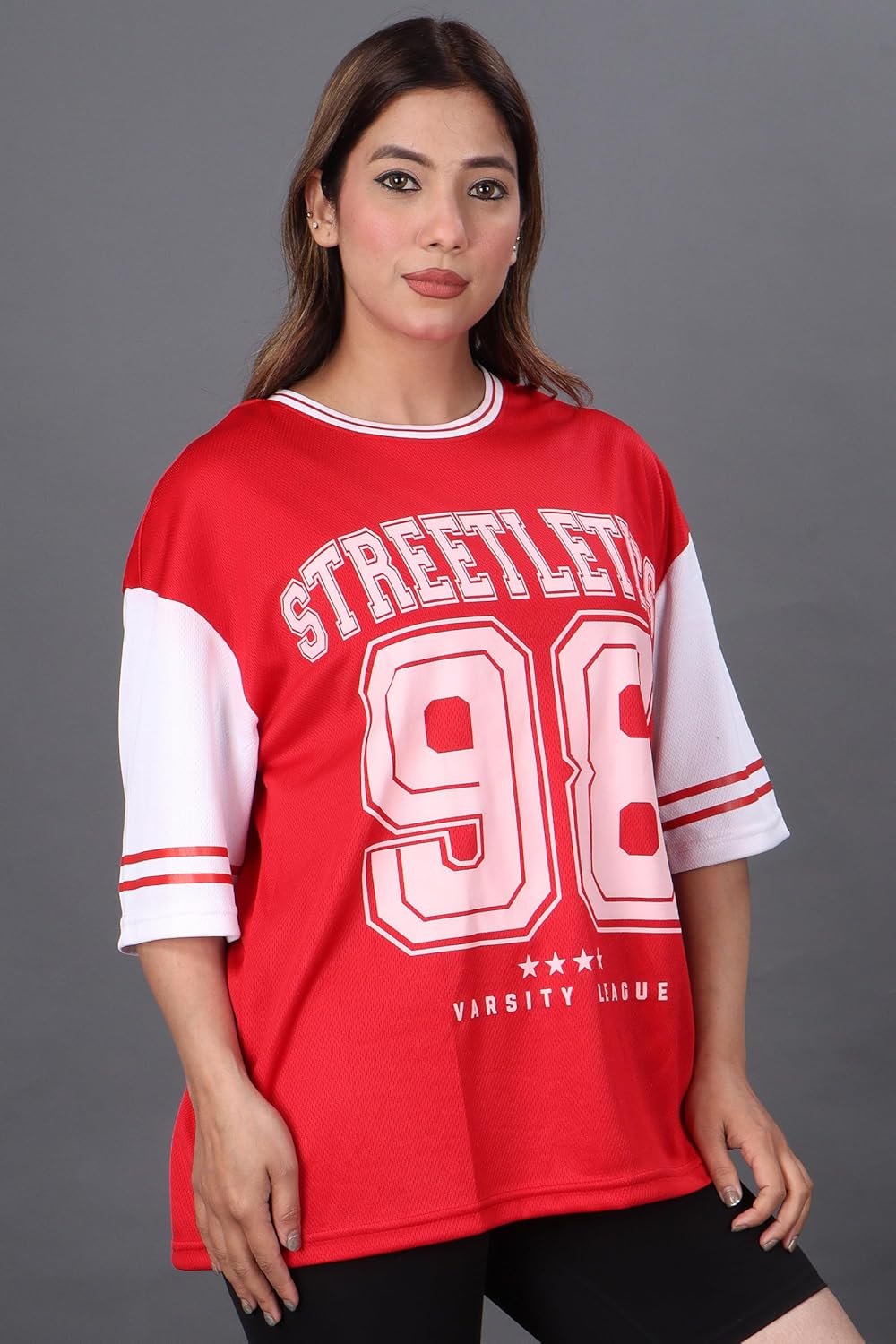 Minimal yet modern, this oversized t-shirt features subtle varsity prints and a clean silhouette—perfect for gym sessions or casual days out.