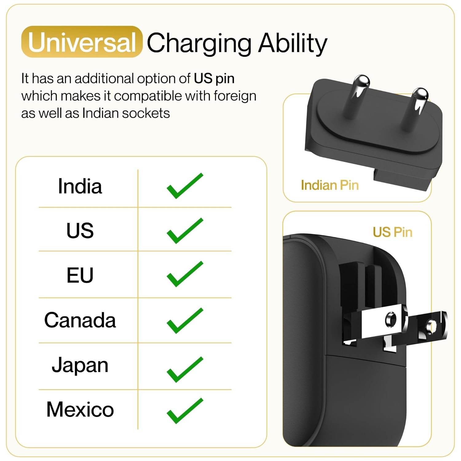The charger features removable pins, allowing you to adapt it for use in different regions, ensuring you stay charged no matter where you are.