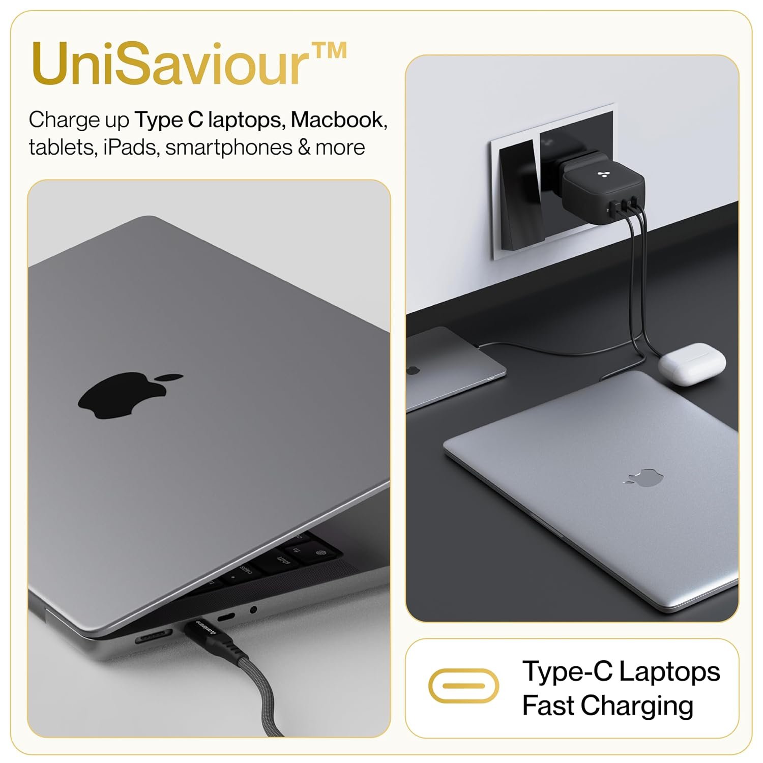 Ambrane 65W Charger Adapter, 3 Ports – 2 Type C & 1 USB for Samsung, Type C Laptops: MacBook, Dell, HP, ASUS, Fast Charger with PD Technology & GaN Technology for All Devices (RAAP G65, Black)