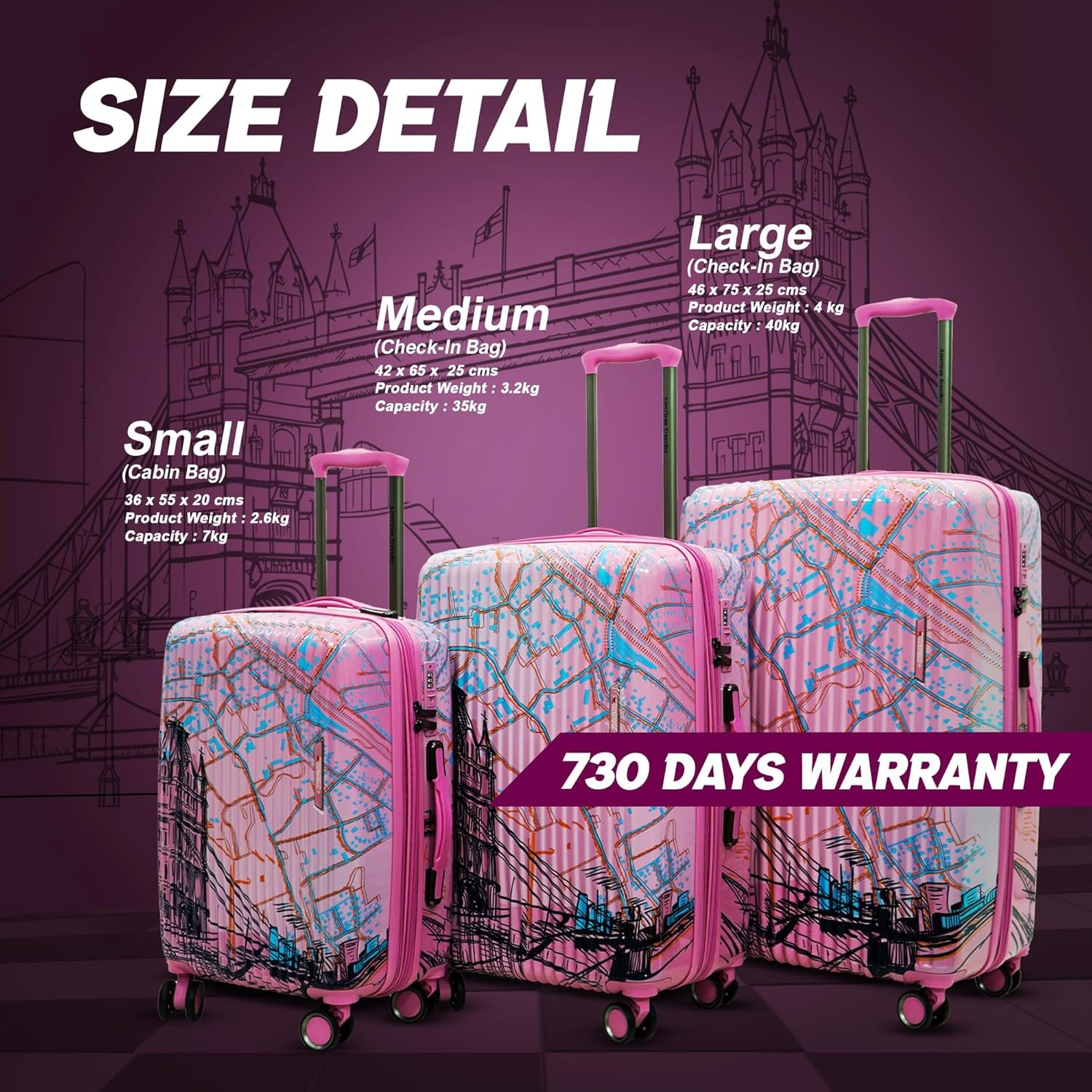 Meet your perfect travel partner – the AMERICAN TRAVELLER London Tower Trolley Bag Set of 3, thoughtfully designed for style, strength, and security. Whether you’re heading for a short escape or a long-haul adventure, this suitcase for travel set of 3 is engineered to deliver unmatched performance and elegance. Crafted from a durable hard shell, each trolley bag is lightweight, scratch-resistant, and built to handle life on the move. The Set of 3 – Cabin, Medium, Large gives you the flexibility to pack just right for every trip. With the ability to nest into one another, this luggage trolley set also stores compactly when not in use. Experience the smooth glide of the 360° LEGO Silen Wheel system that moves in every direction with minimal noise or effort—making this the ideal spinner trolley luggage for busy airports and bustling streets. For added peace of mind, each bag is equipped with a secure TSA type lock and anti-theft zippers, offering superior protection for your valuables. The interiors are just as smart, featuring dual compartments with wet/dry separation, zip pockets, and compression straps that keep your belongings organized and wrinkle-free. The telescopic handle ensures easy maneuvering, while the top and side grips offer multiple lifting options. Stylish in every way, the bright yellow design stands out on any carousel. From the durable materials to the ergonomic build, this trolley bag set of 3 is the perfect blend of form and function. Backed by a 730-day warranty, the American Traveller London Tower travel suitcase set is your trusted companion for journeys far and wide. Choose this trolley bag collection when you want reliability, innovation, and standout style—all in one premium luggage trolley set.