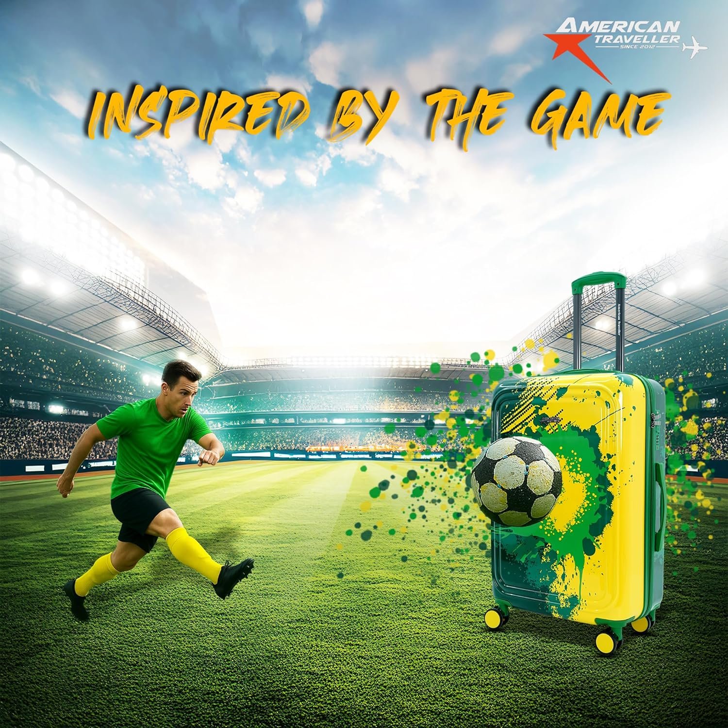 American Traveller TourisGlide Sport Luggage Trolley Bag Set of 3 (PC) Durable Hard Shell for Travel Suitcase with 360° Disk Wheels| TSA Type Lock| Heavy-Duty Lining| Football Splash (3, Green)