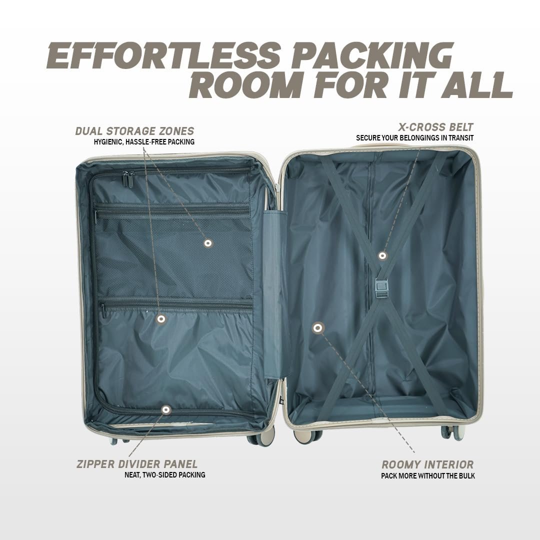✅SPACIOUS INTERIOR & SMART STORAGE: Pack with ease using wet/dry compartments, X-Cross belts & divider panels. This trolley bag maximizes space for organized, two-sided packing.