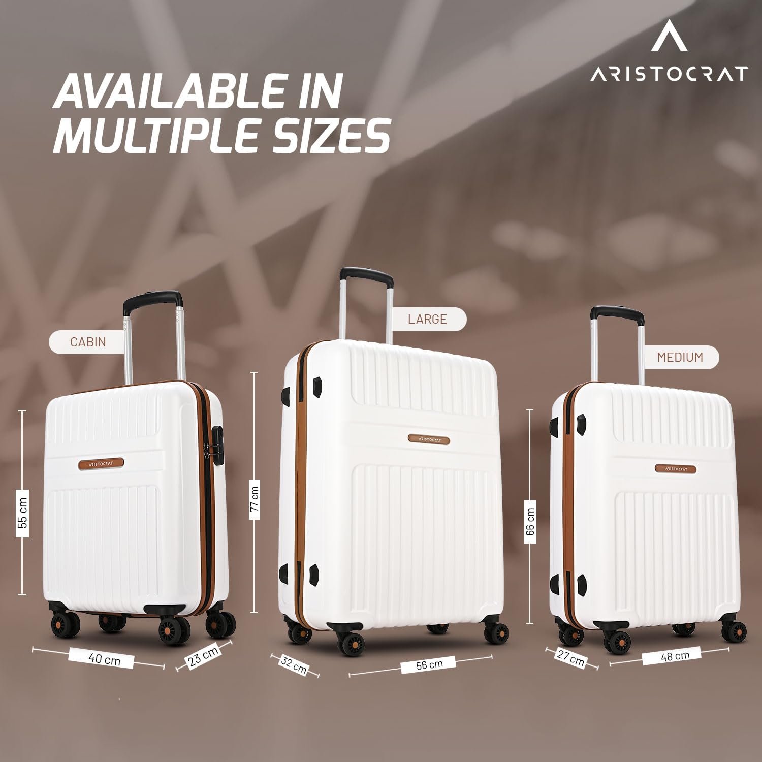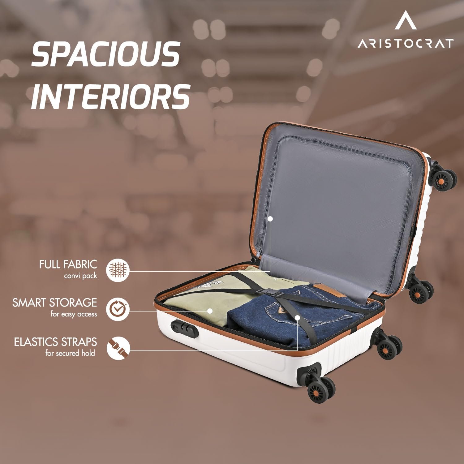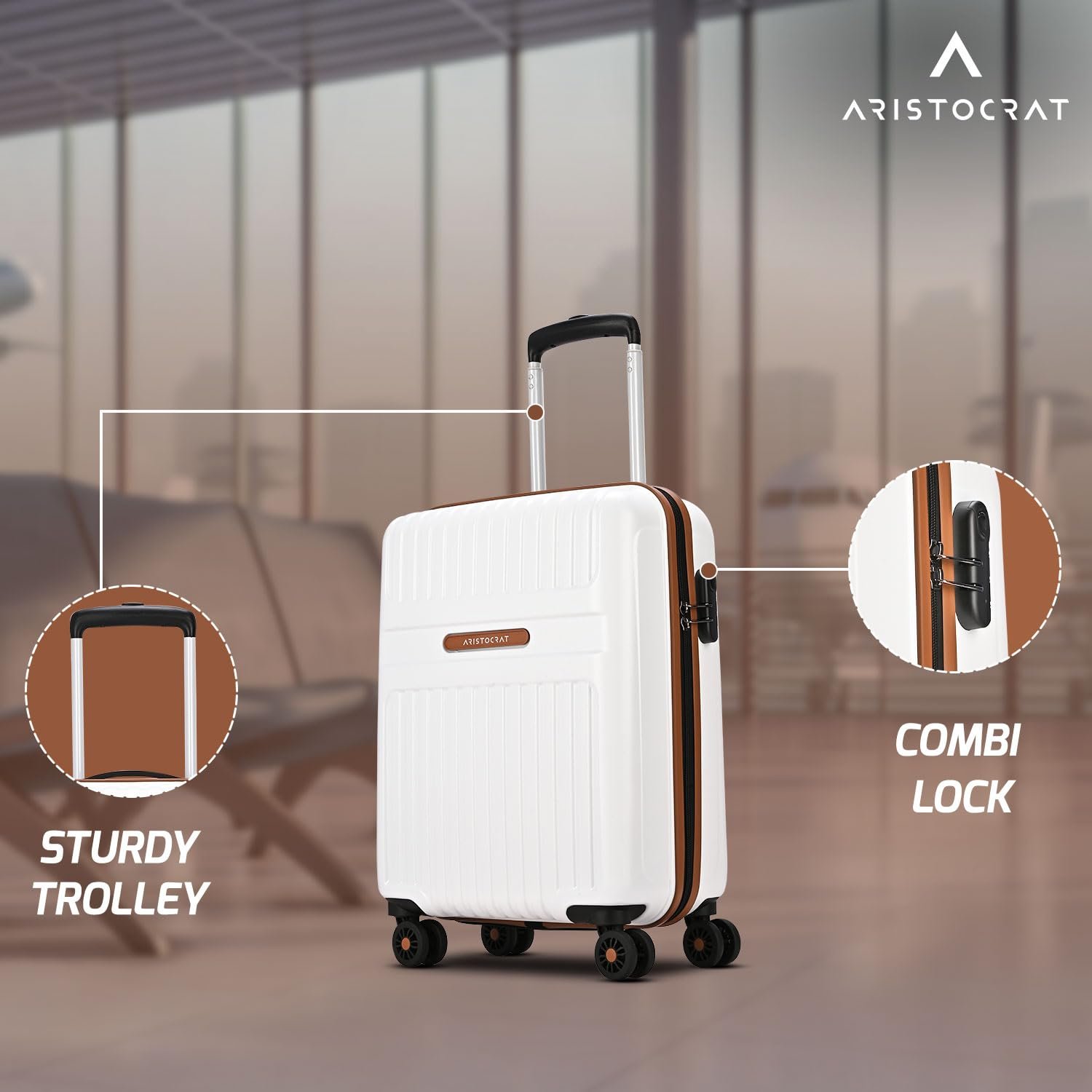 Aristocrat Atlas Cabin Trolley Bag 55cm | Small | Hard Luggage | Smooth 8-Wheel Suitcase | Secure Combination Lock with Sturdy Zipper | Full Fabric Convipack | 3-Year Warranty (Pearl White)