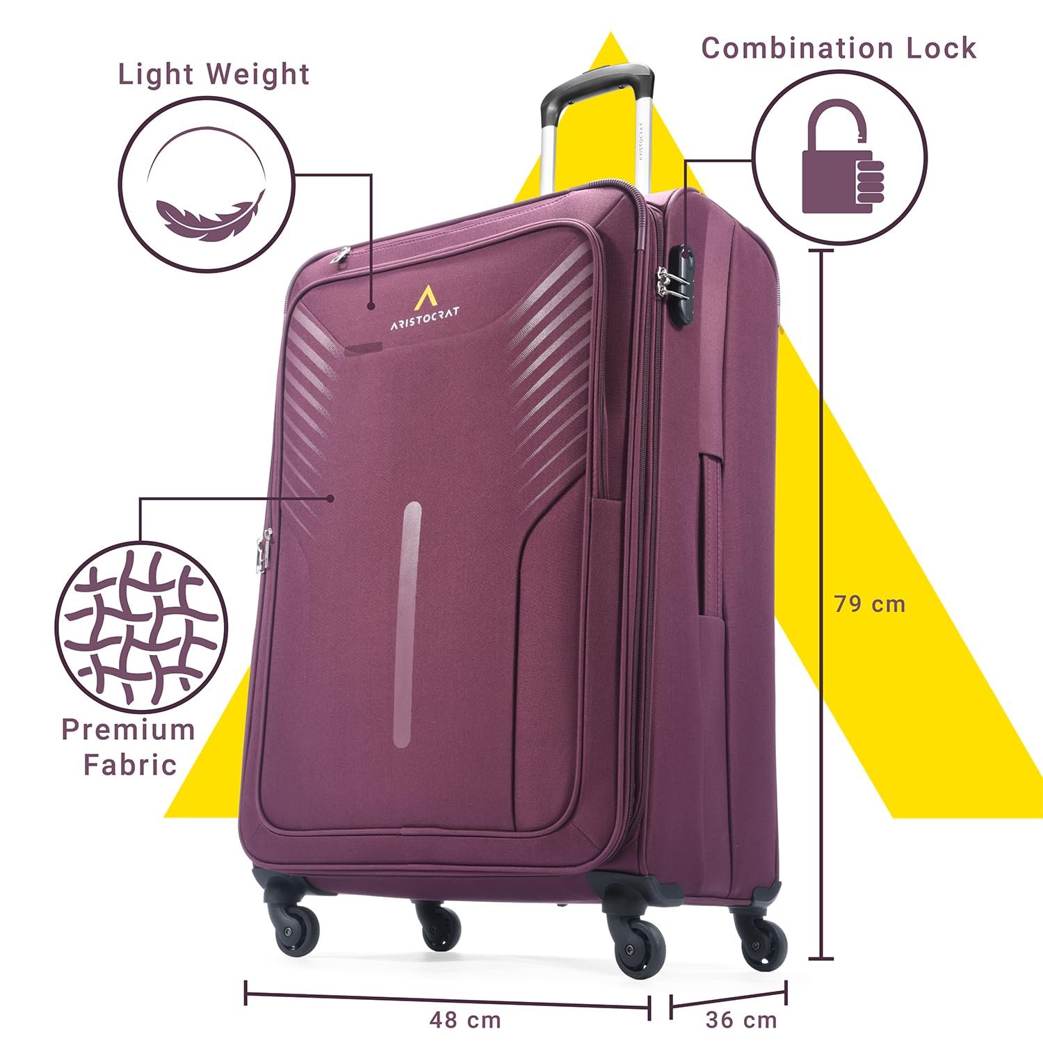 DURABILITY & LONGEVITY :Unleash adventures with Aristocrat AIRPLUS: stylish, secure, and durable softcase luggage, backed by 5-year warranty!