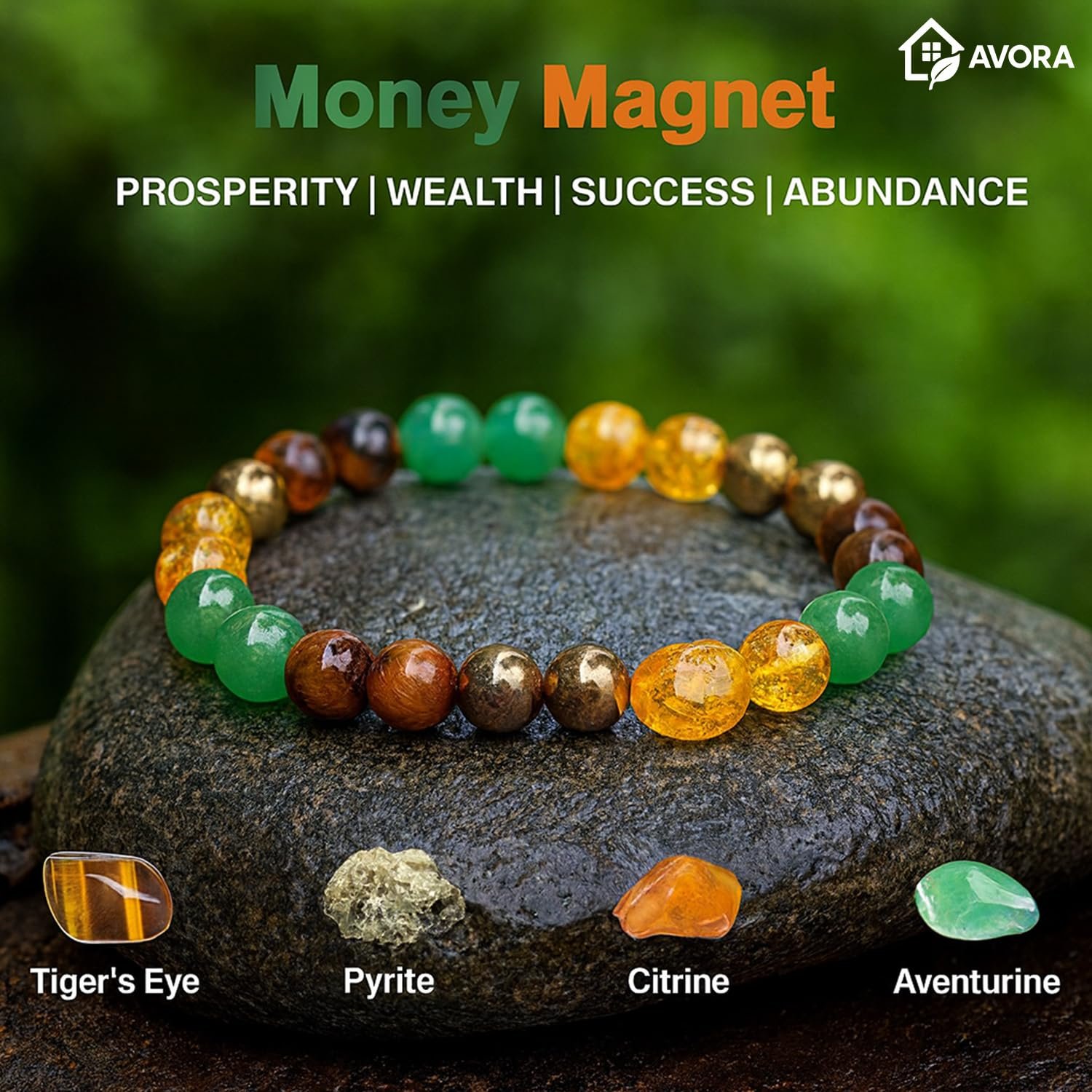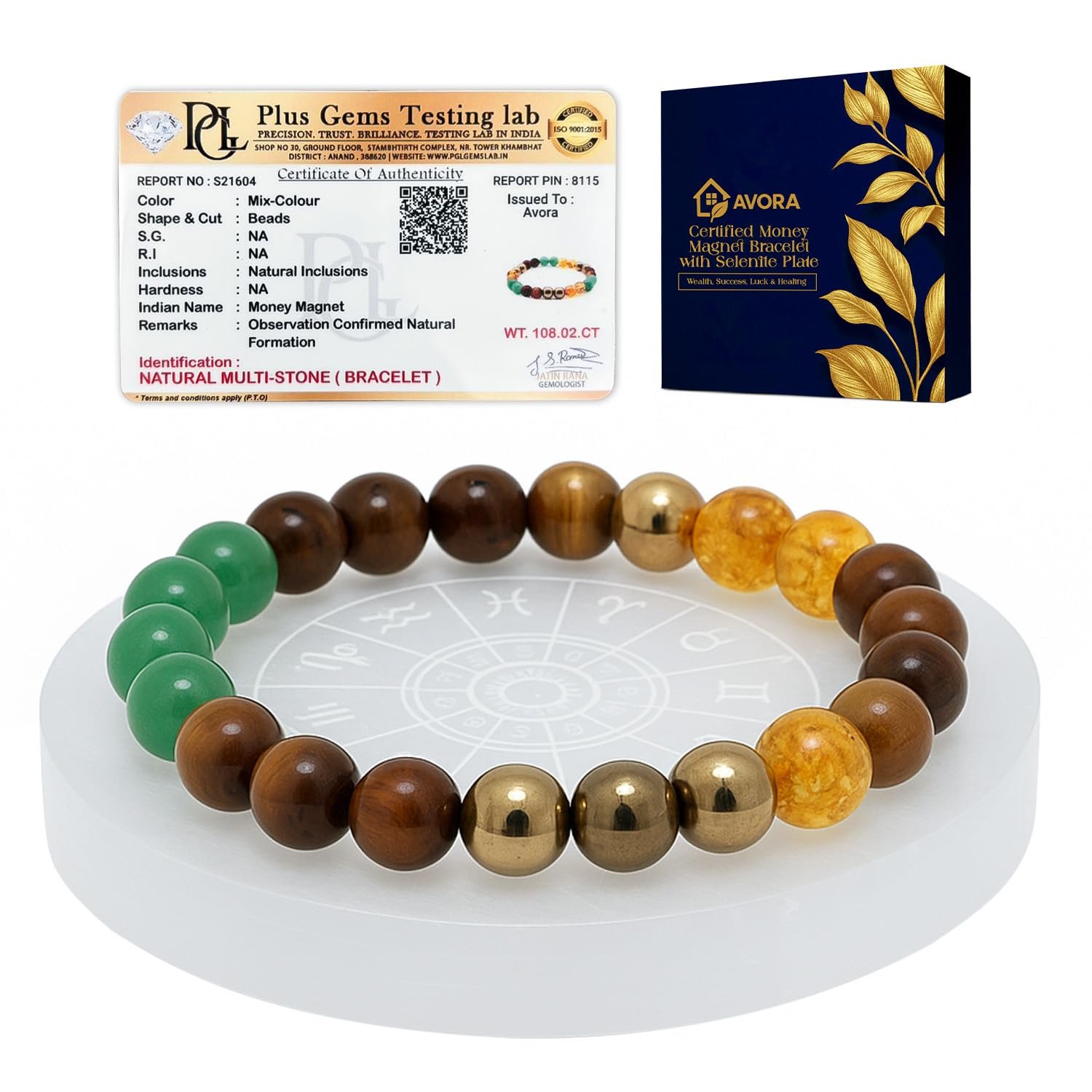 AVORA Sampurn Dhan Combo with Money Magnet & Selenite Charging Plate | Citrine, Jade, Tiger Eye & Pyrite Crystal Bracelet for Wealth, Luck & Prosperity | Unisex Spiritual Gift Set