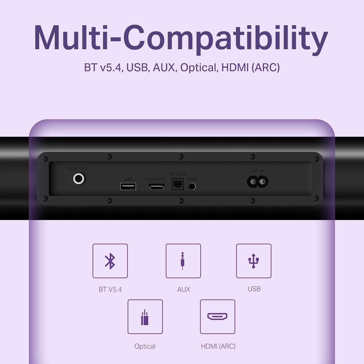 Multiple Ports: Offering USB, aux, optical, Bluetooth v5.4, and HDMI (ARC) connectivity, you can stay plugged into the sound the way you prefer.