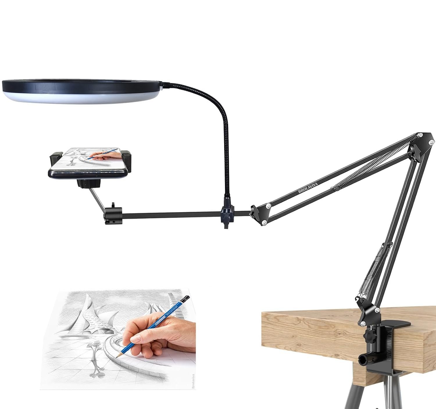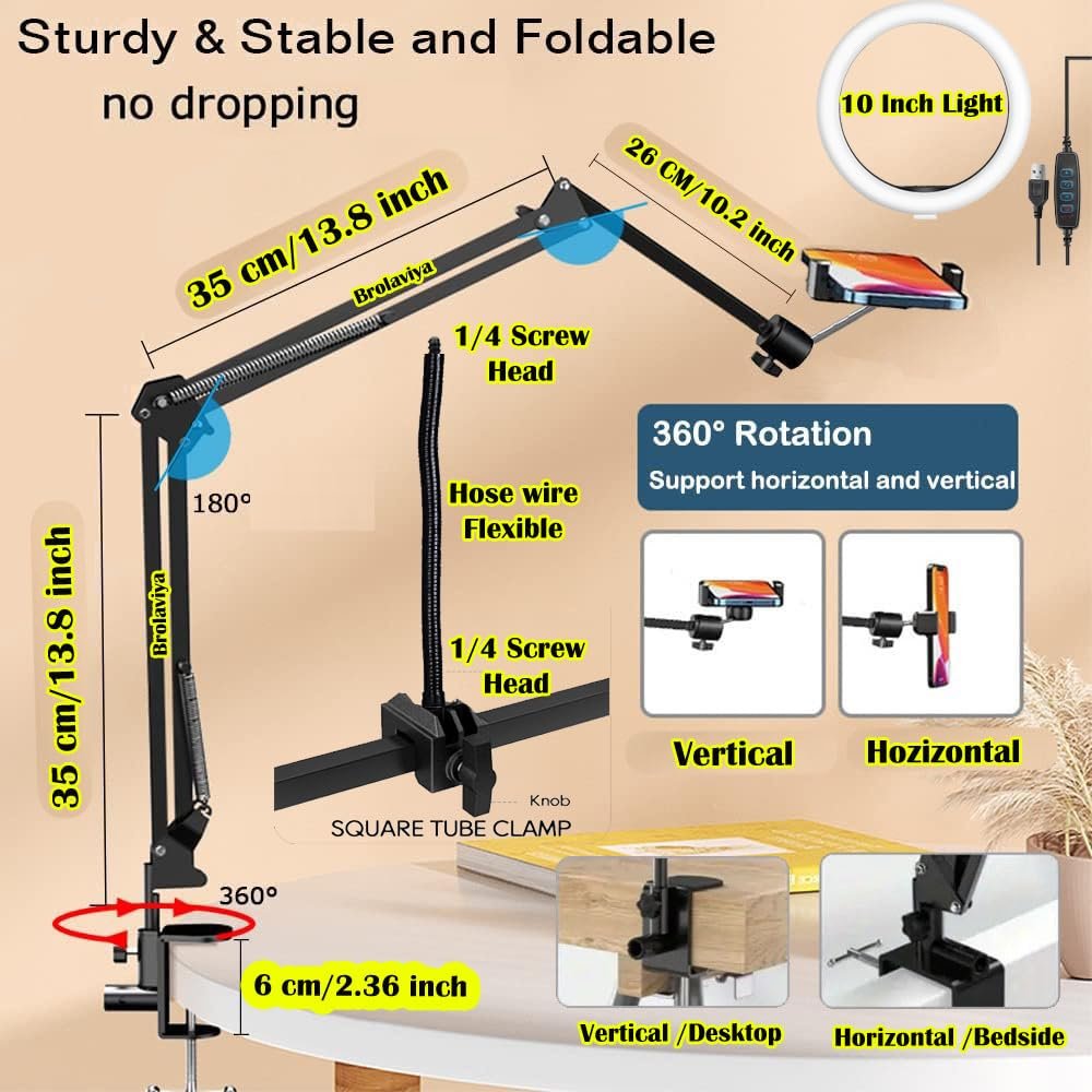BROLAVIYA No Shadow Overhead Video Mobile Stand, Extra Long Metal Arm,10inch Selfie Ring Light, Flexible Wire, 2-Way Base Clip, 1/4″ Head for Camera, GoPro, for Desktop, Bedroom, Office
