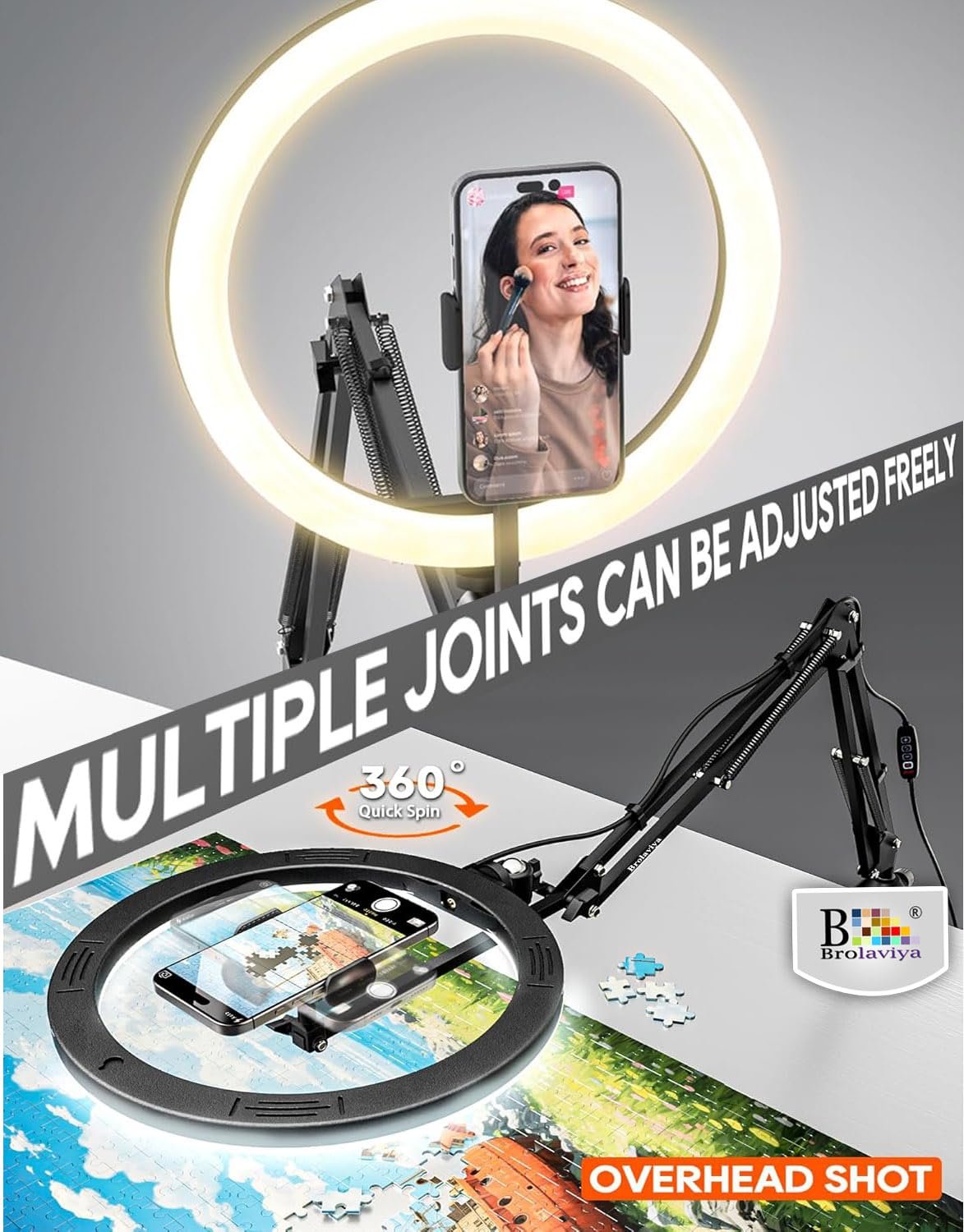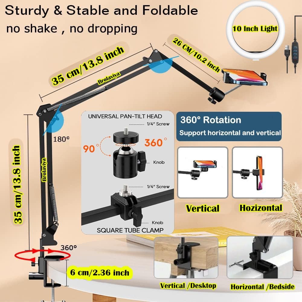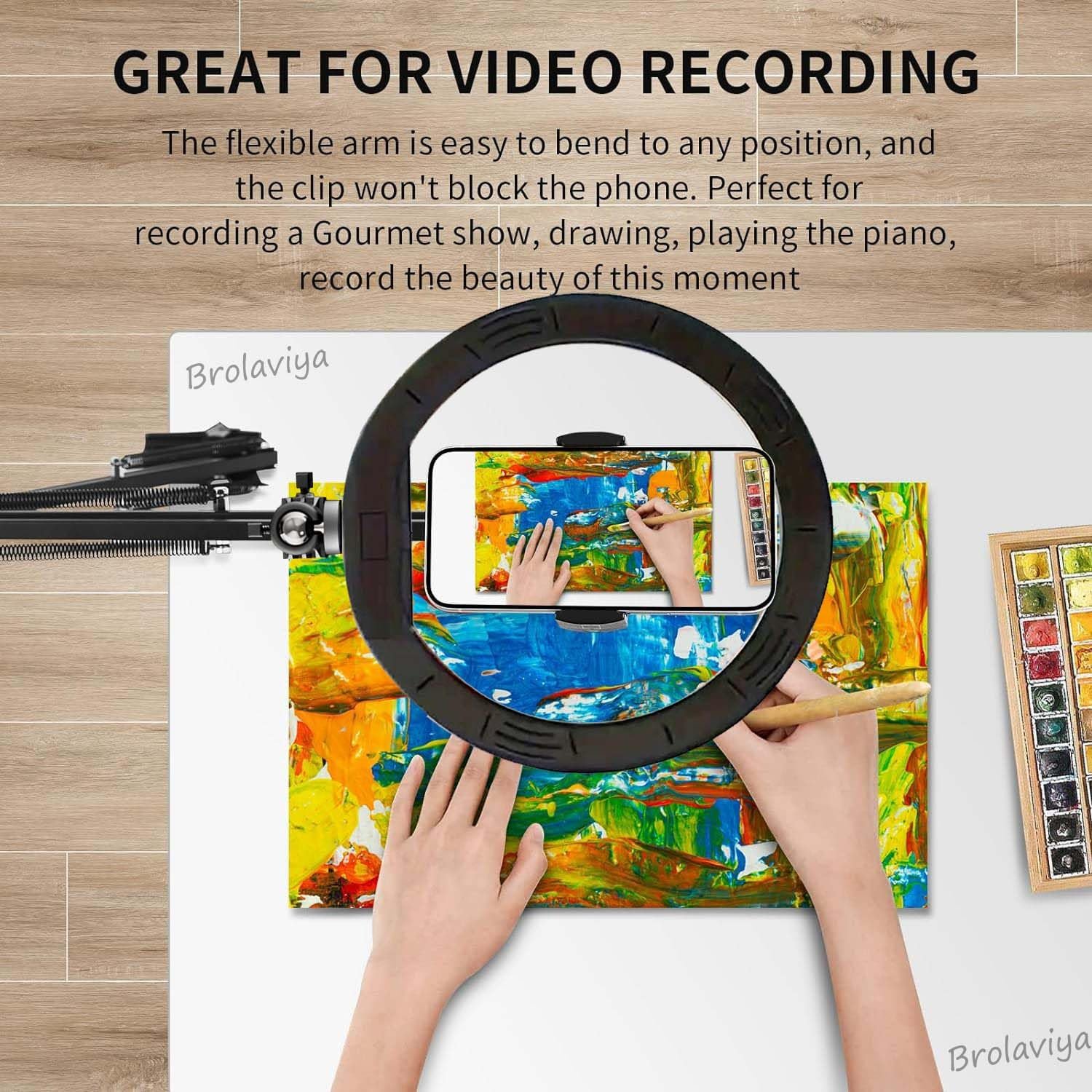 BROLAVIYA No Shadow Overhead Video Mobile Stand with Extra Long Metal Arm,10inch Selfie Ring Light,2 Way Base clamp 1/4″ Adaptor for Camera, GoPro and Mobile Bracket for Desktop, Bedroom, Office