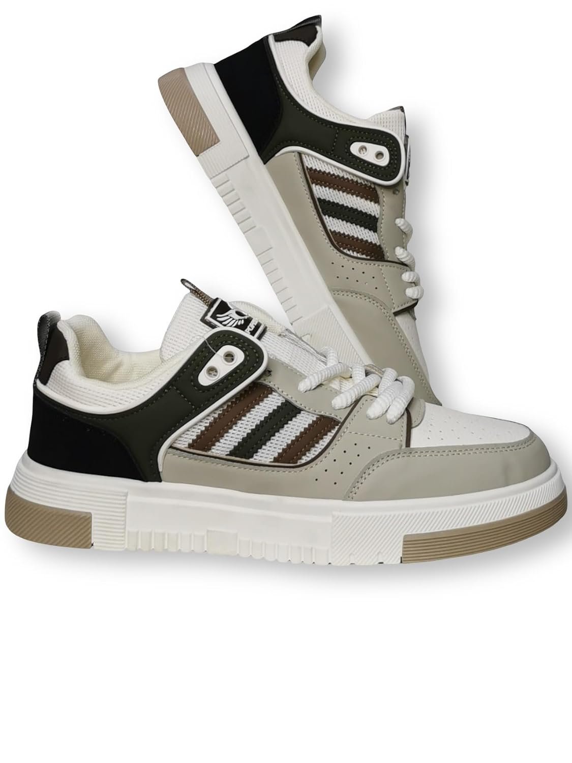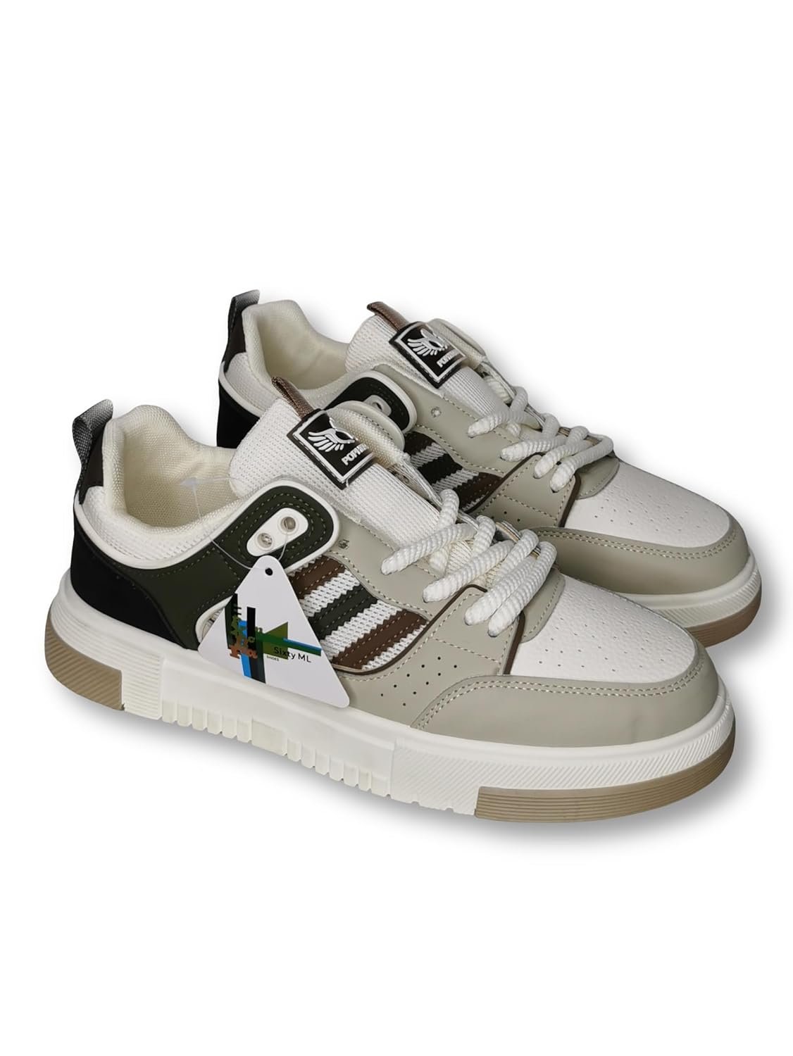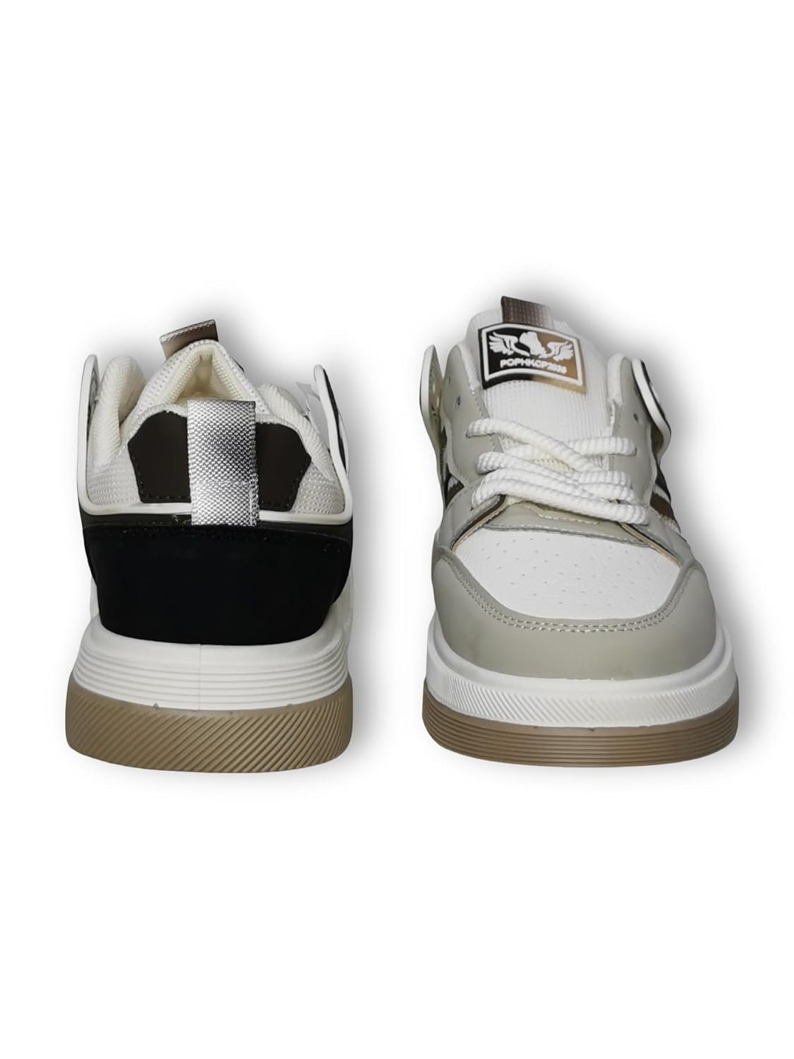 Step into style and comfort with these Pork&Paws casual athletic sneakers. These versatile high-top sports shoes feature a sophisticated grey and white colour scheme with distinctive striped accents. The perforated toe box ensures optimal breathability during wear, while the padded collar and cushioned insole provide exceptional comfort for all-day use. The durable rubber outsole showcases an intricate chevron pattern for reliable traction, complemented by a chunky midsole that adds both style and stability. The classic lace-up closure ensures a secure, adjustable fit, while the branded wing logo adds a touch of distinctive character. These sneakers effortlessly blend athletic functionality with casual style, making them perfect for both active pursuits and everyday wear. The premium construction features quality materials throughout, from the reinforced stitching to the moisture-wicking inner lining. Whether paired with joggers for a sporty look or casual trousers for a more refined appearance, these sneakers deliver both performance and fashion-forward appeal.