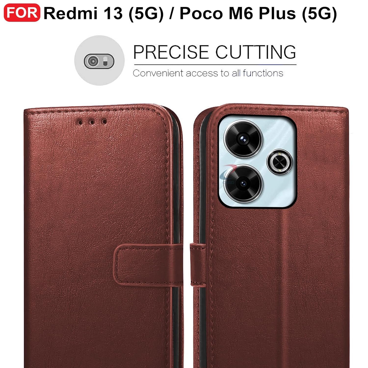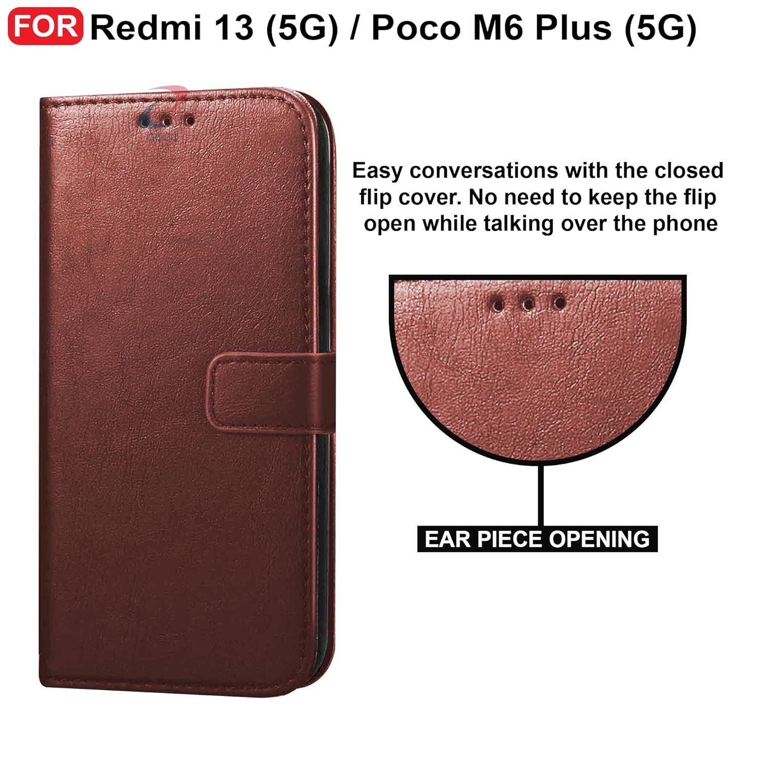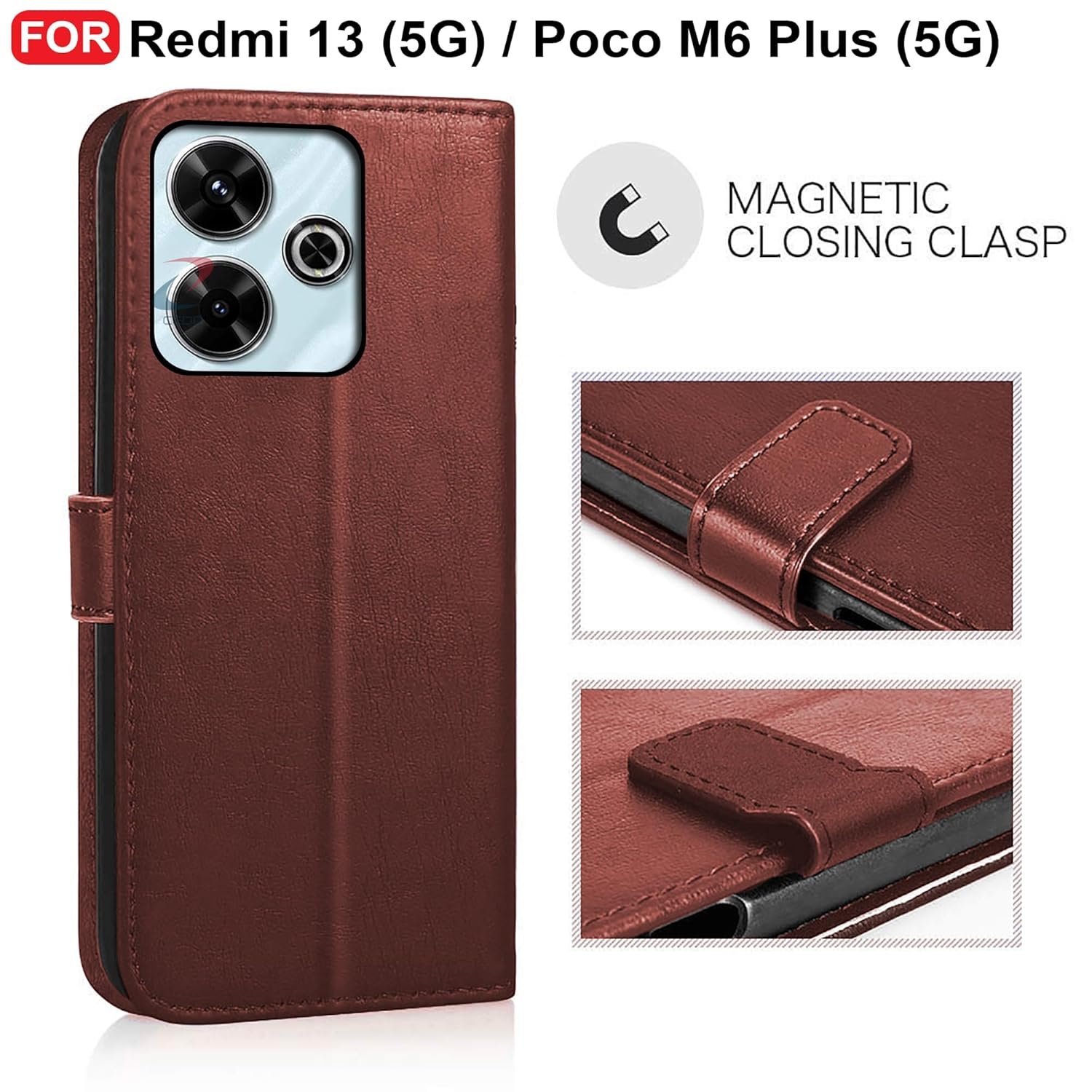 CEDO Redmi 13 (5G) / Redmi 13 Prime Edition/Poco M6 Plus (5G) Flip Cover | Leather Finish | Inside Pockets & Inbuilt Stand | Shockproof Wallet Style Magnetic Closure Back Case Flipcover (Brown)