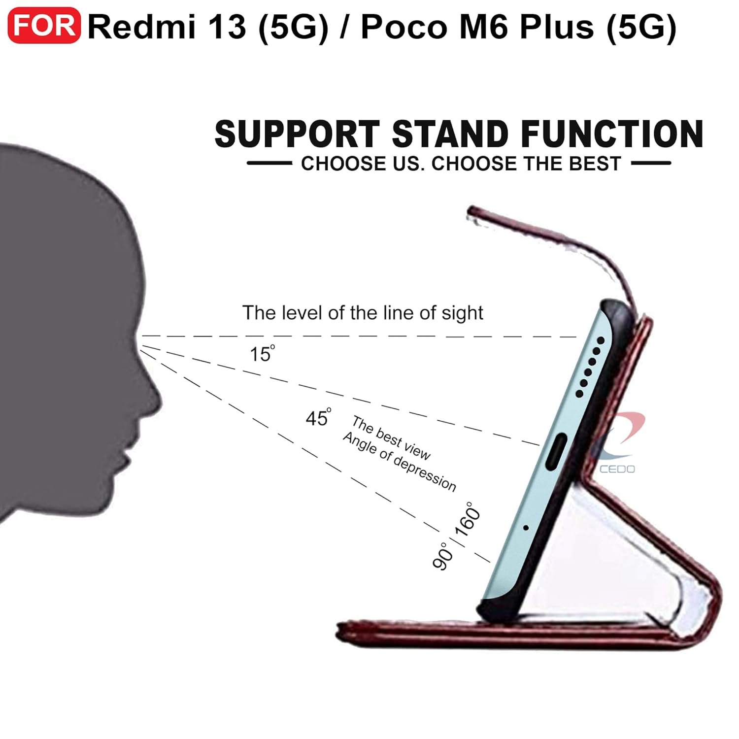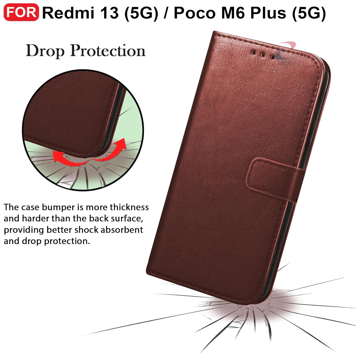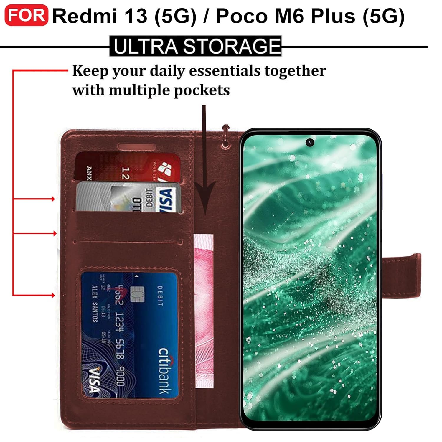 CEDO Redmi 13 (5G) / Redmi 13 Prime Edition/Poco M6 Plus (5G) Flip Cover | Leather Finish | Inside Pockets & Inbuilt Stand | Shockproof Wallet Style Magnetic Closure Back Case Flipcover (Brown)