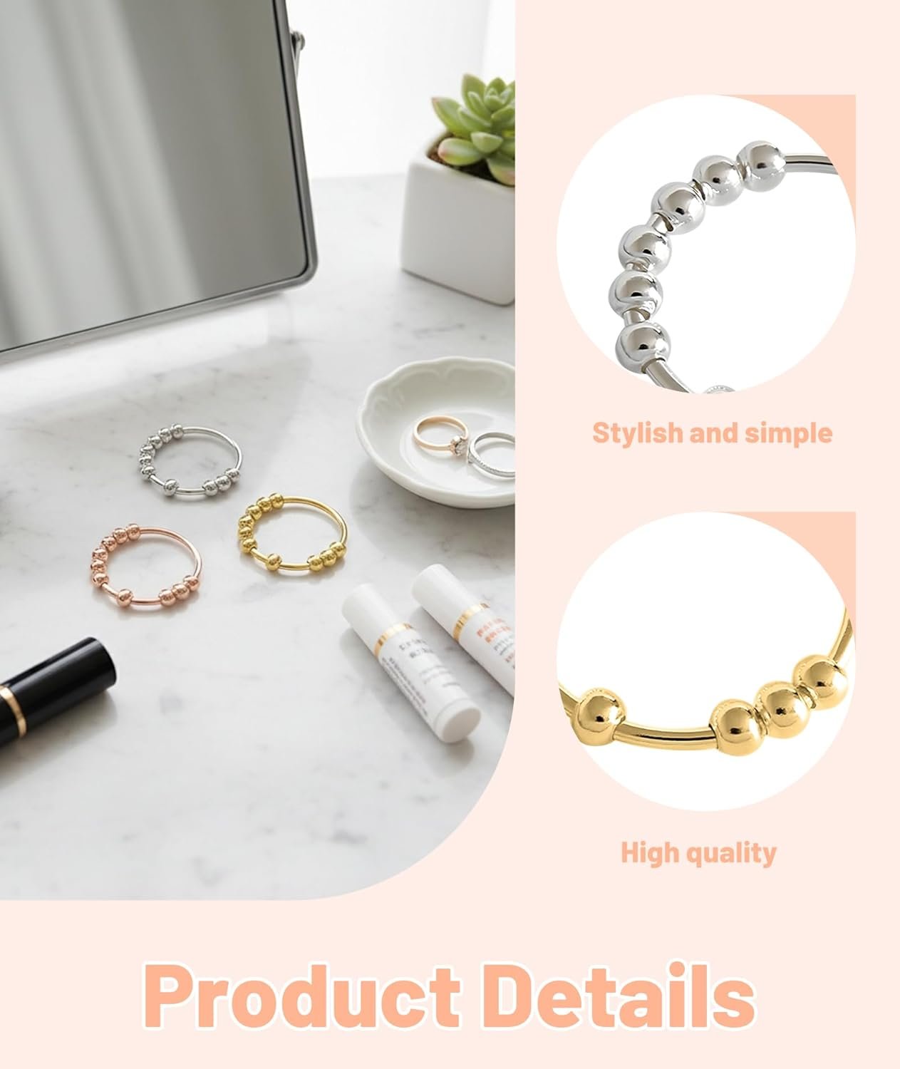 Chrbdonica 3PCS Fidget Ring, Anxiety Ring for Men and Women, Gold Ring for Men, Stylish Rings for Girls, Rotating Bead Rings for Stress Relief, Office, Study, Gift (Gold, Rose Gold, Silver)