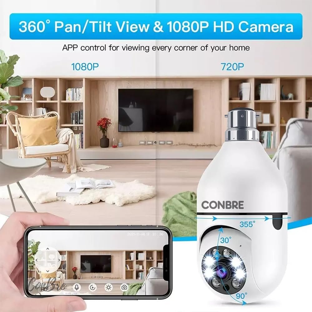 Conbre BulbXR 2MP Full HD Indoor Wireless WiFi CCTV Security Camera | Motion Tracking | Two Way Talk | Colored Night Vision | Support Upto 128GB SD Card | Includes Indian Holder