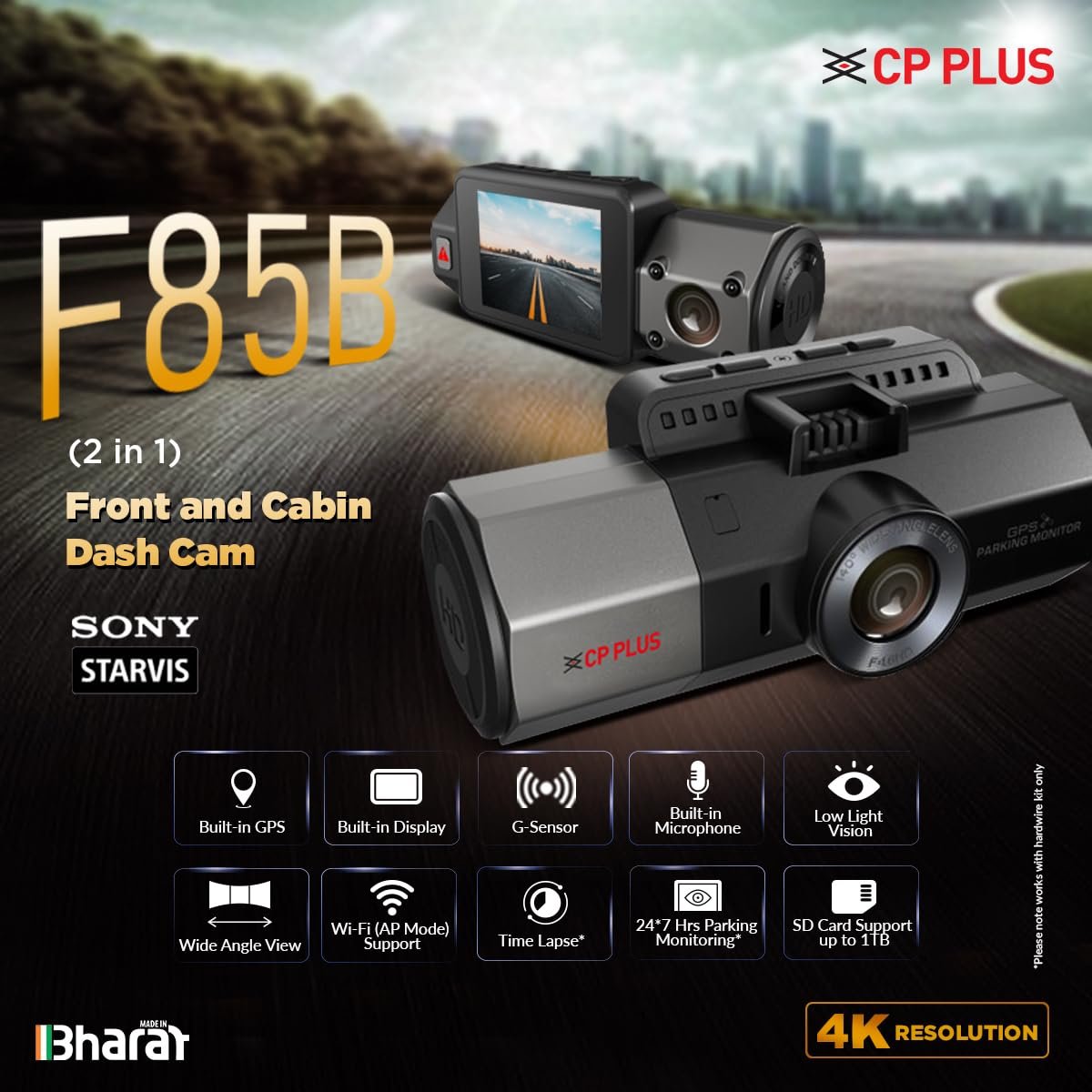 CP PLUS 4K Dashcam for Car with Sony Starvis | 8MP Front + FHD Cabin Dash Camera | Built-in GPS | Wi-Fi App Control | G-Sensor | Night Vision | Time-Lapse | SD Card up to 1TB | CP-F85B