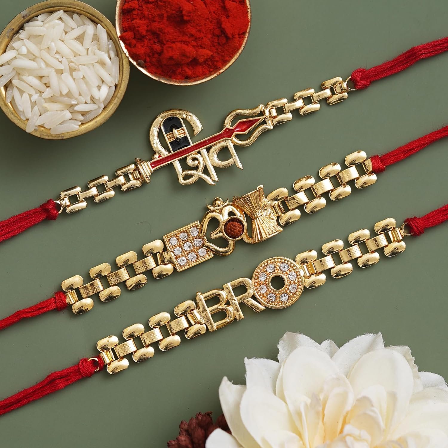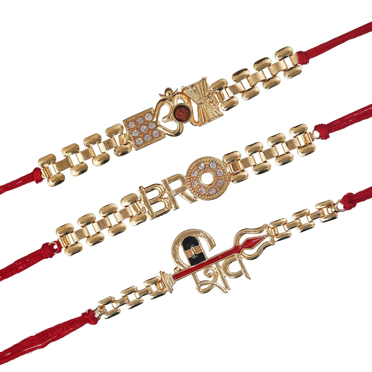 eCraftIndia Set of 3 Golden & Red Lord Shiv Damru, Om, Bro Designer Religious Rakhis, Best Bro Ever Fridge Magnet with Roli Chawal Pack – Rakhi for Brother, Bhaiya, Bhai