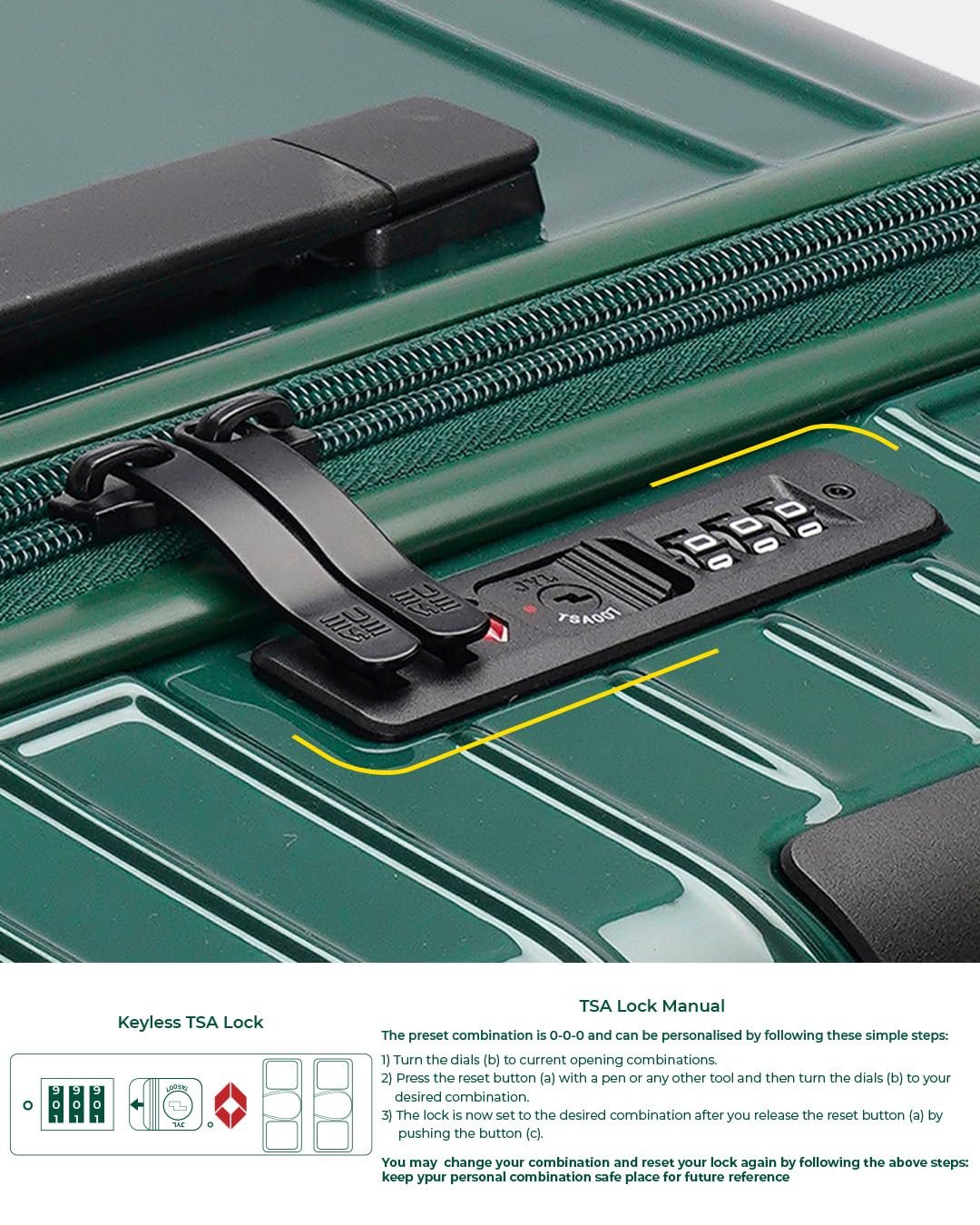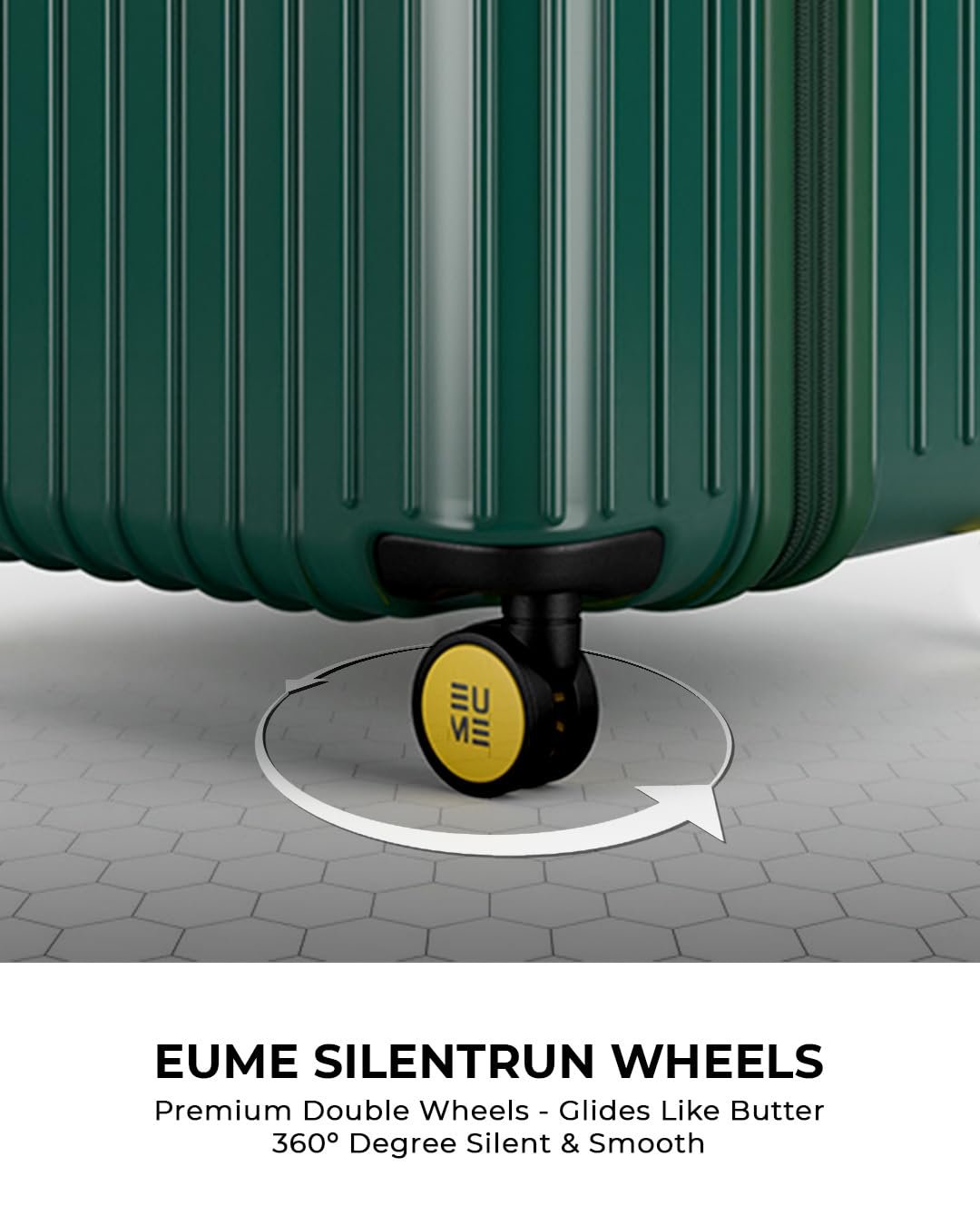 This medium size trolley are crafted from durable 100% German Bayer Polycarbonate (PC), ensuring lightweight yet sturdy construction. These traveling bags feature EUME SilentRun 360-degree double wheels, cushioned axles, and TSA-approved locks for smooth, secure travel.