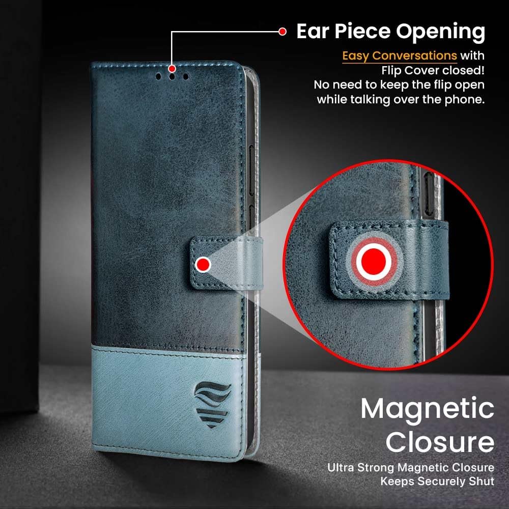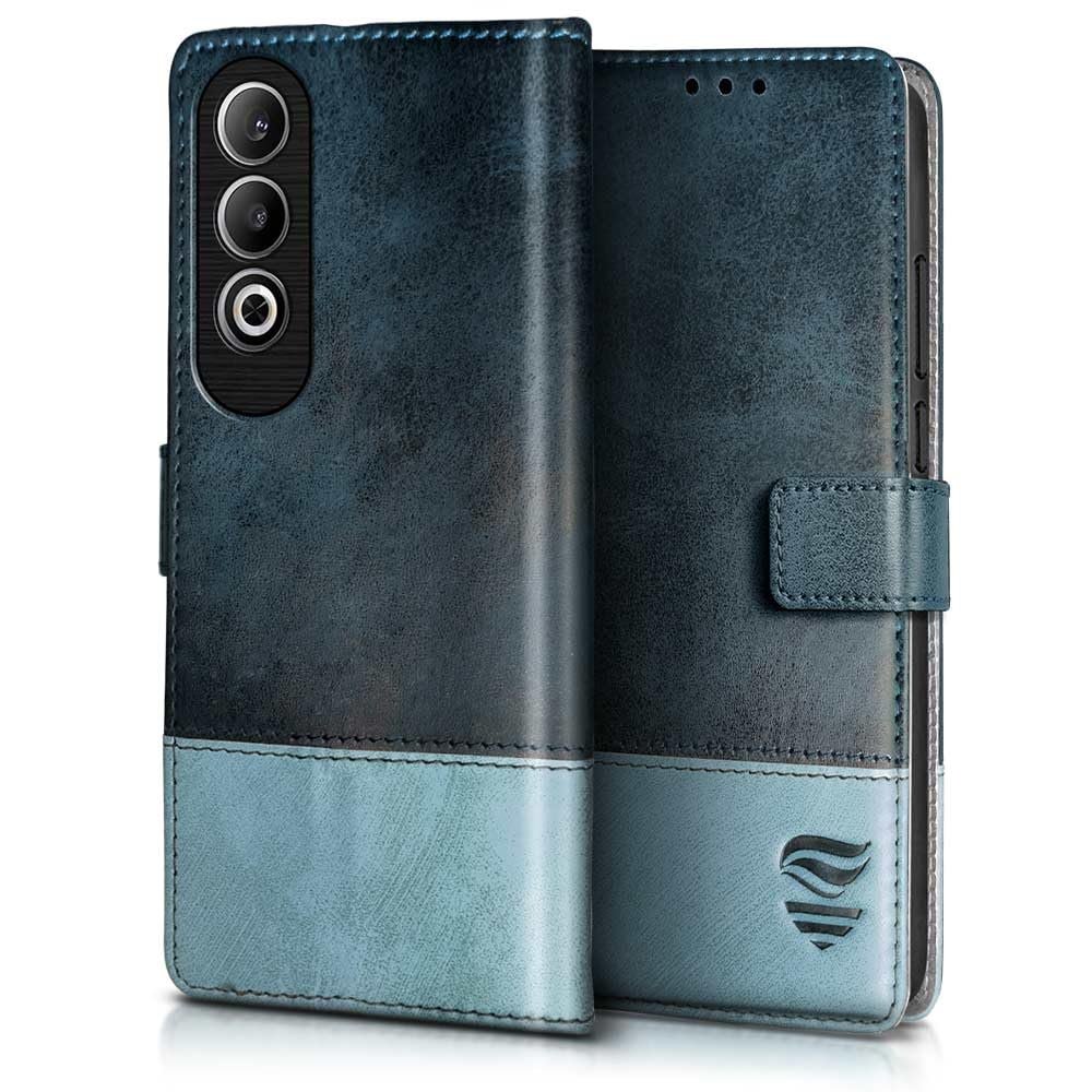 FLIPPED Vegan Leather Flip Case Back Cover for 1+ OnePlus Nord CE 4 5G (Flexible, Shock Proof | Hand Stitched Leather Finish | Card Pockets Wallet & Stand | Blue with Aquamarine)