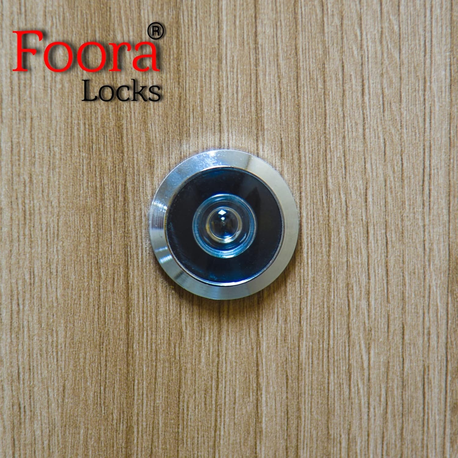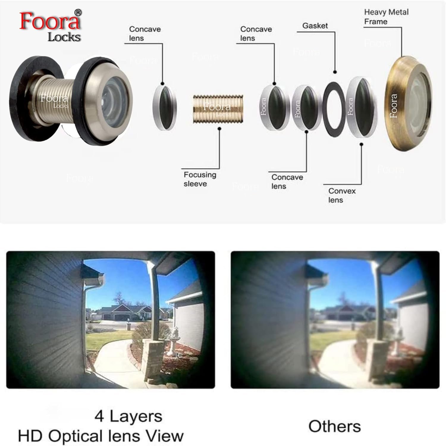 Foora Door eye HD Optical Glass Lens Offers 220-Degree Crystal Clear Panoramic View-The HD optical glass lens provides a 220-degree sharp and crystal clear panoramic view. It covers the area from the porch ceiling to the doormat, extending to both sides of the doorway across the street. You can spot packages without opening the door and easily see anyone present outside from head to toe. There is no blind spot where a person might lurk, offering you and your family top-level safeguard and security.
