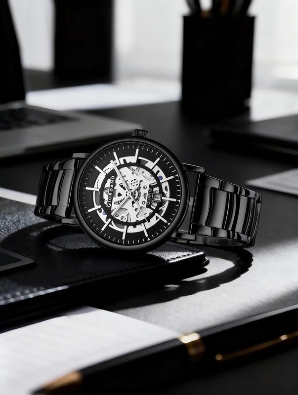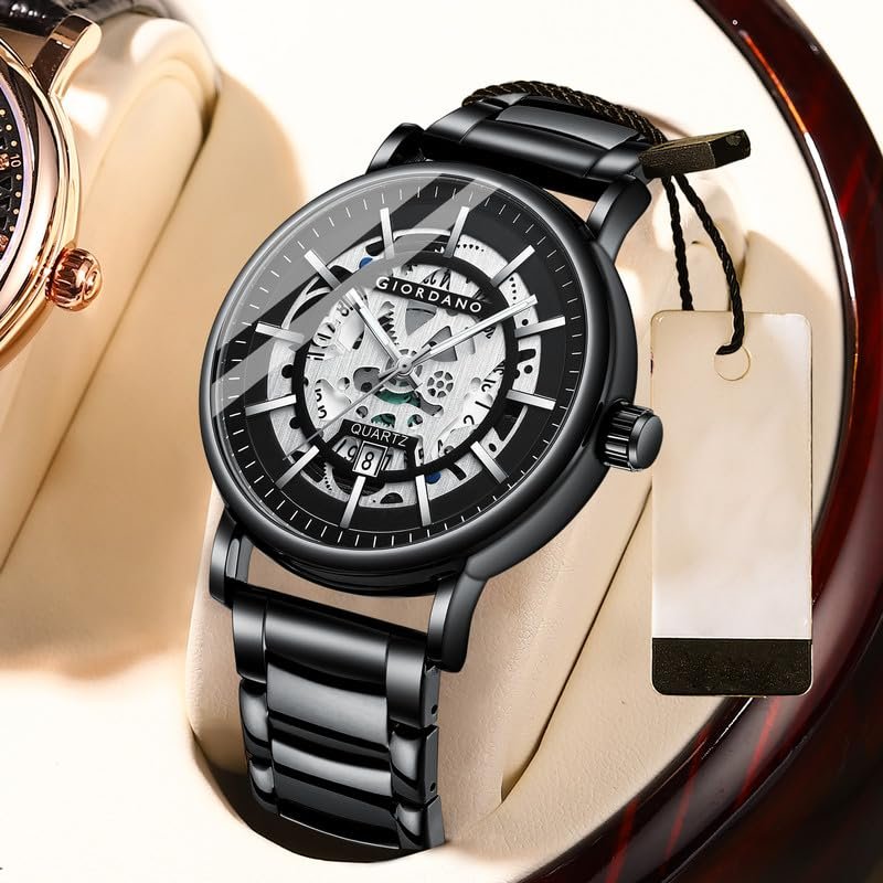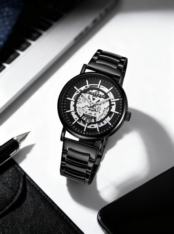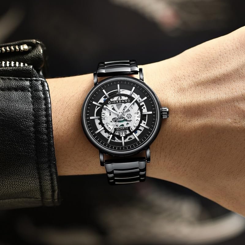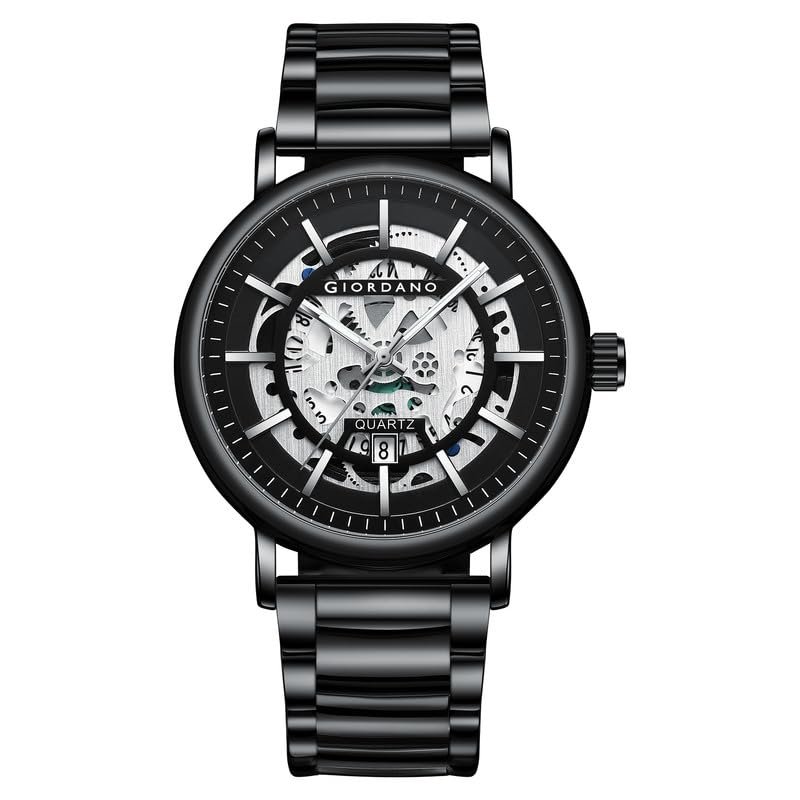 Giordano Classic Skeleton Design Watch for Men with Super Luminous Hands, Stainless Steel Strap, and Date Display