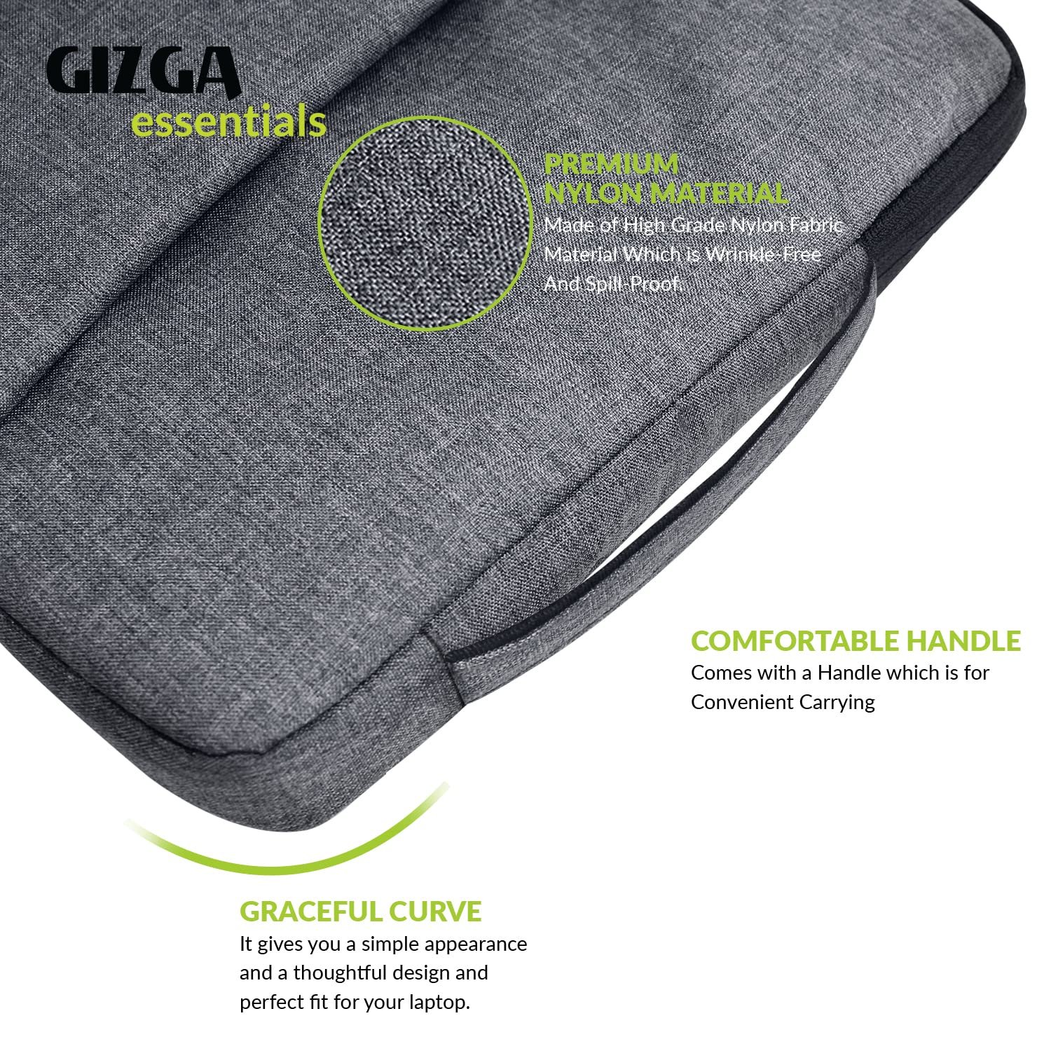 Gizga Essentials 14.1 Inch Laptop Sleeve Case Cover Pouch Bag With Handle & Front Pocket | Slim & Water-resistant Nylon Fabric With Shockproof Foam Padding, Soft Lining & Premium Zipper Closure (Grey)