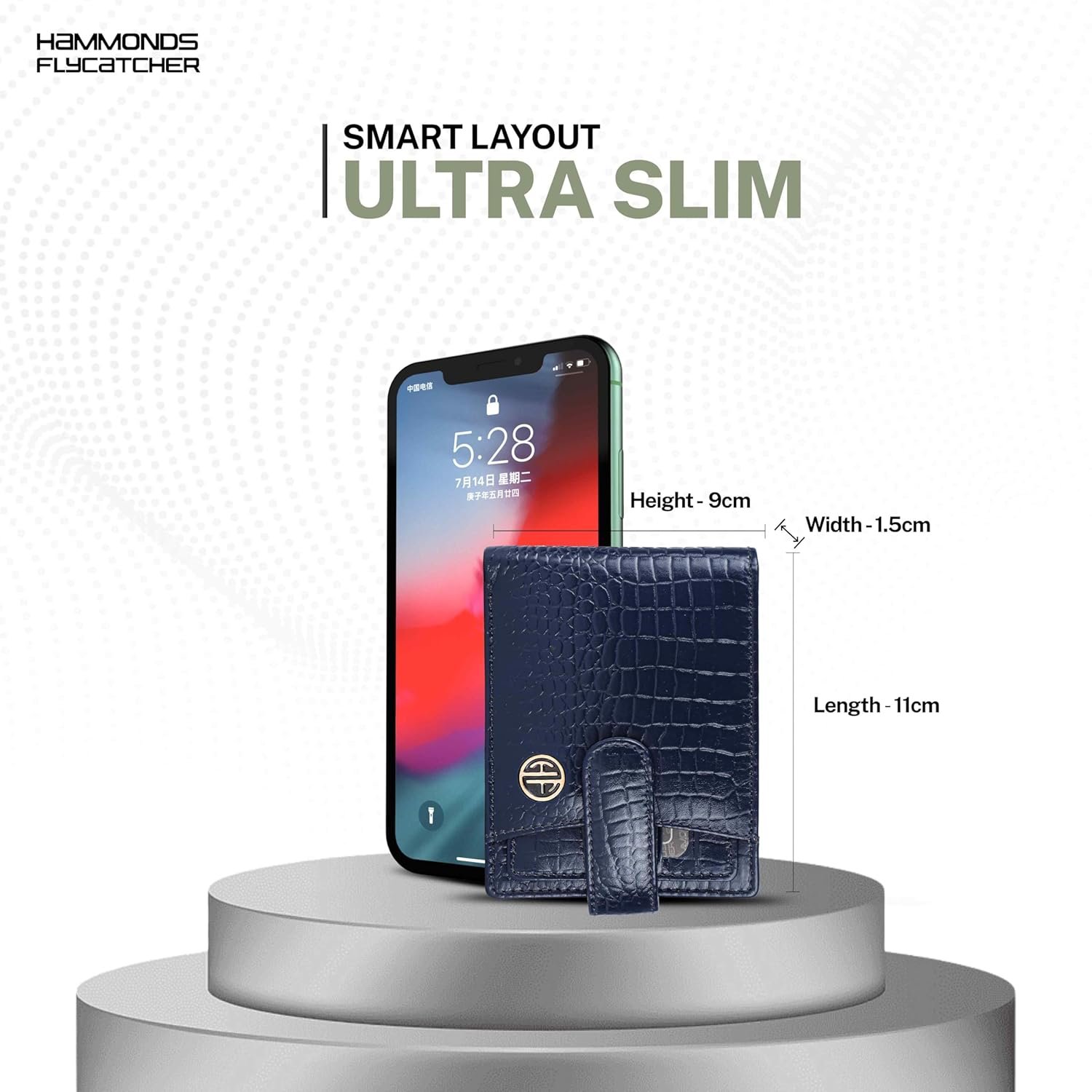 The wallet measures 11cm (Length) x 2cm (Width) x 9cm (Height). Its compact size allows it to fit comfortably in pockets while providing ample storage for essentials.