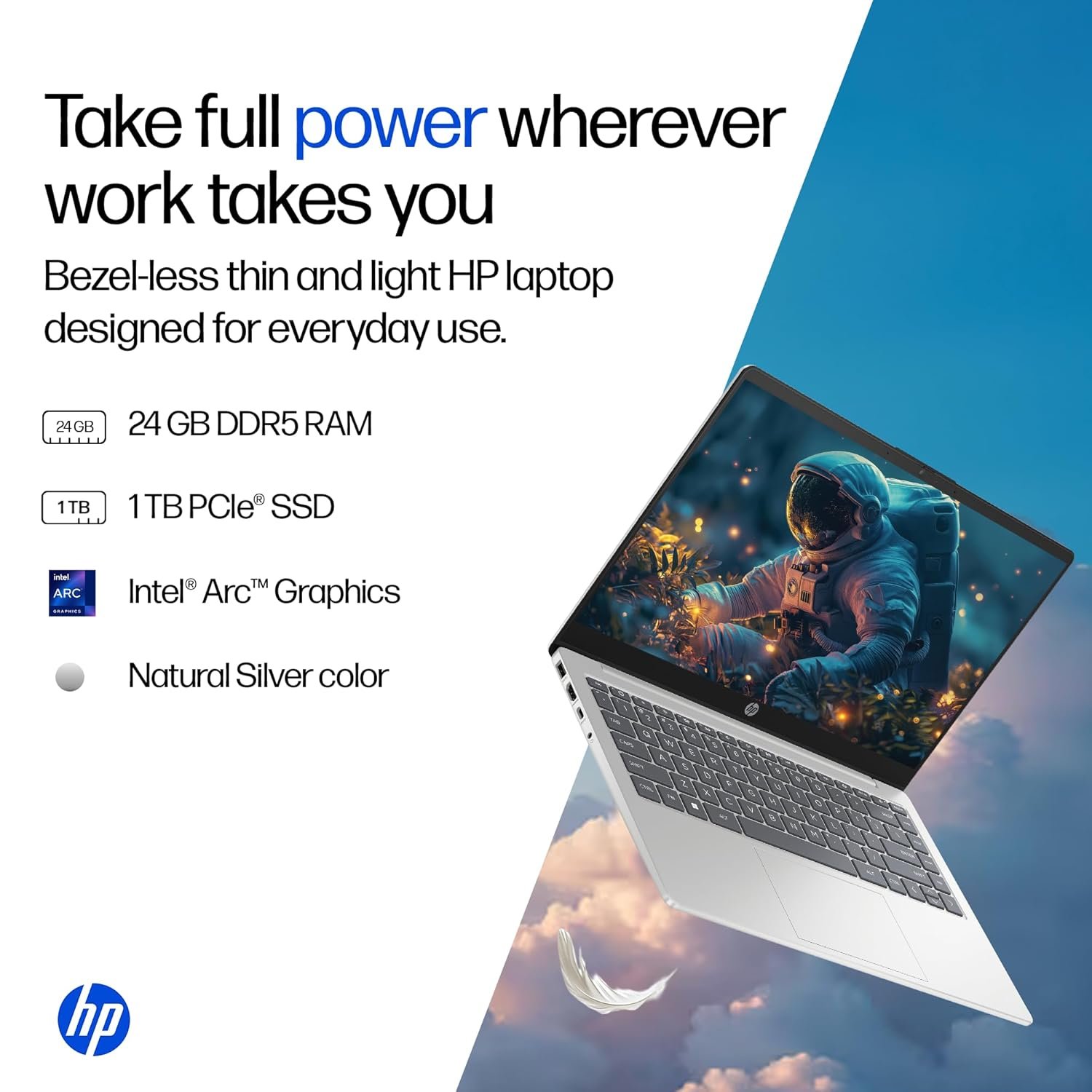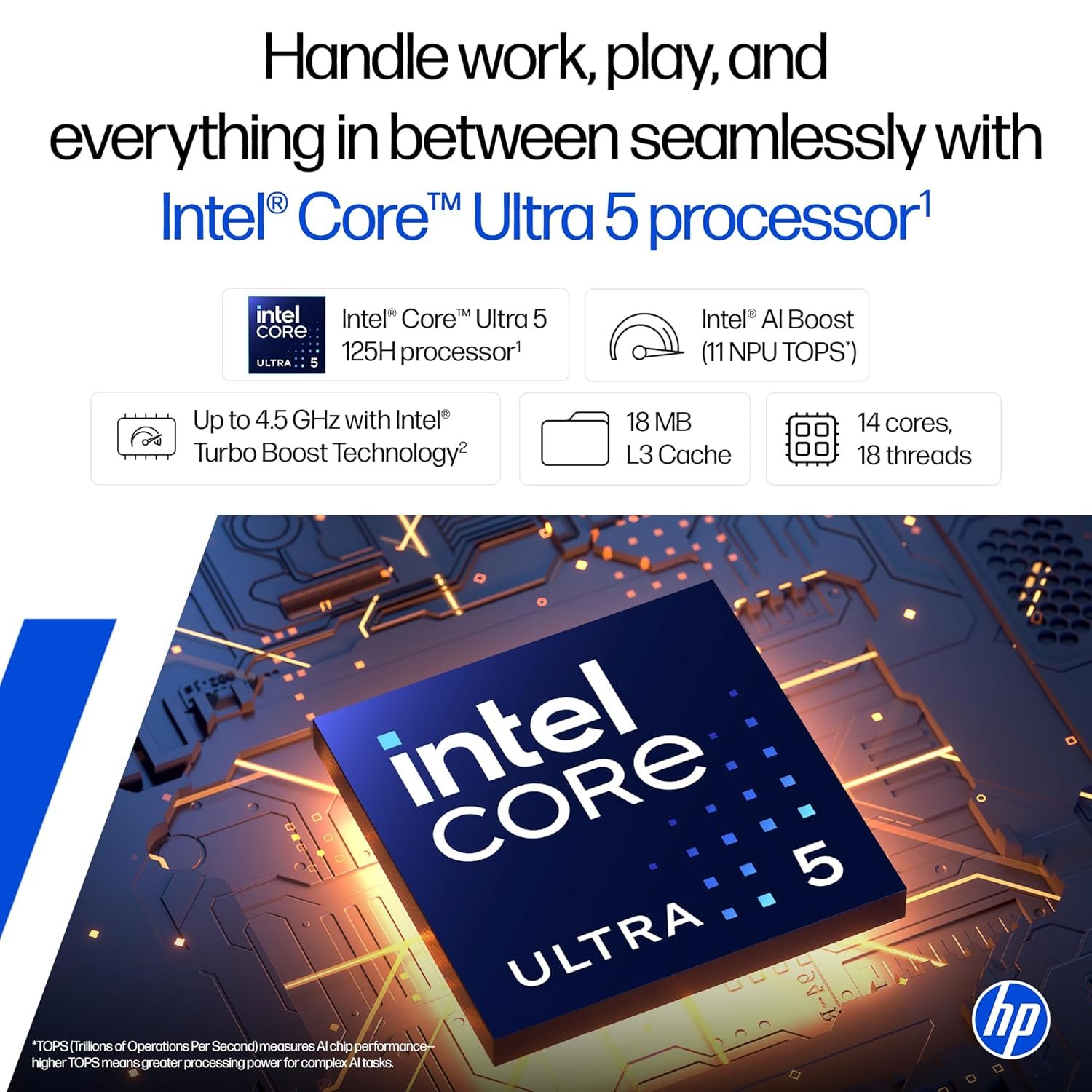 Processor, Memory & Storage: Intel Core Ultra 5 125H (up to 4.5 GHz with Intel Turbo Boost Technology, 18 MB L3 cache, 14 cores, 18 threads)| Memory: 24 GB DDR5-5600 MT/s (1 x 24 GB)| Storage: 1 TB PCIe NVMe M.2 SSD