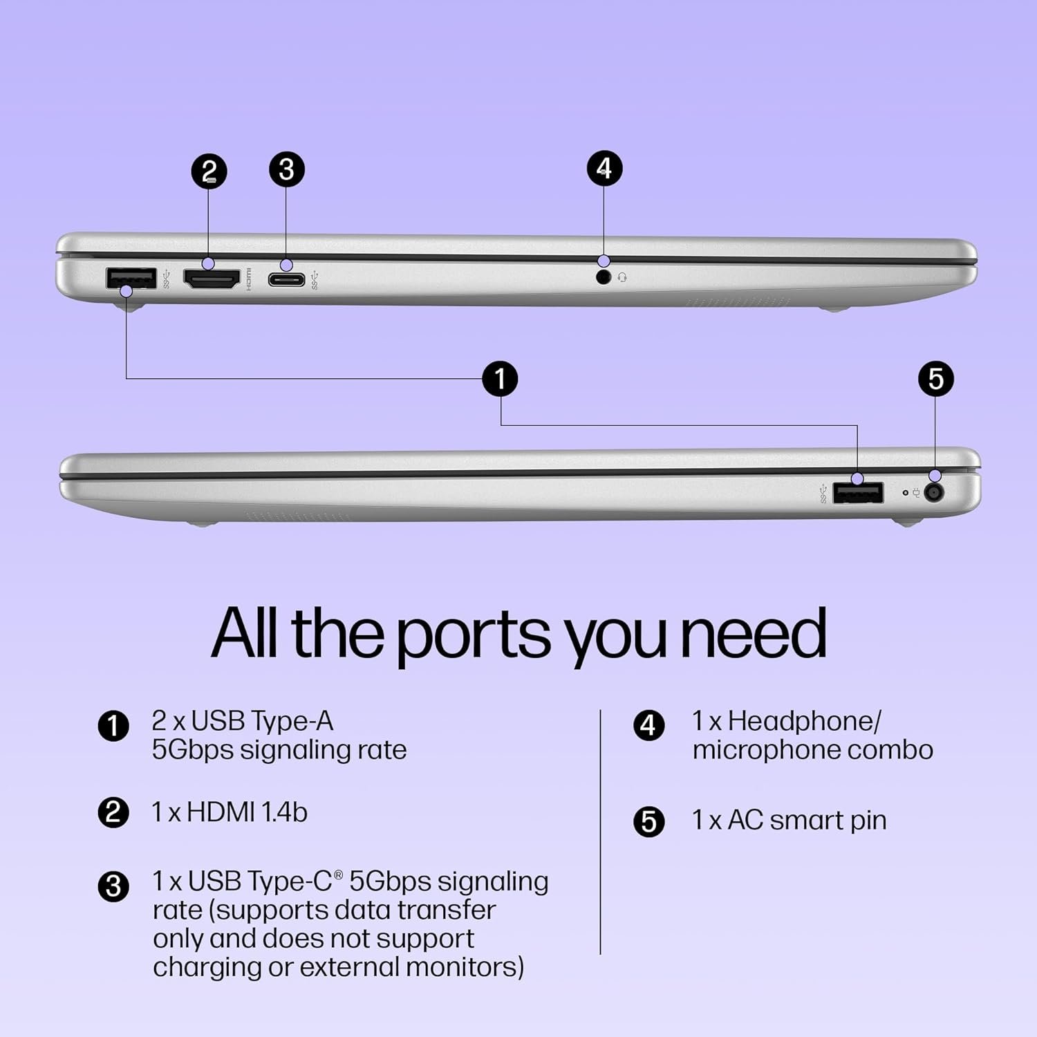 Ports & Connectivity :1 USB Type-C 5Gbps signaling rate (supports data transfer only and does not support charging or external monitors); 2 USB Type-A 5Gbps signaling rate; 1 AC smart pin; 1 HDMI 1.4b; 1 headphone/microphone combo| Connectivity: Realtek Wi-Fi 6 (2×2) and Bluetooth 5.3 wireless card (supporting gigabit data rate)