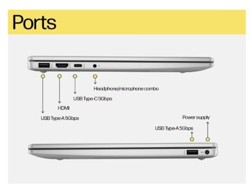 Ports & Connectivity : 1 USB Type-C 5Gbps signaling rate (supports data transfer only and does not support charging or external monitors); 2 USB Type-A 5Gbps signaling rate; 1 AC smart pin; 1 HDMI 1.4b; 1 headphone/microphone combo| Connectivity: Realtek Wi-Fi 6 (1×1) and Bluetooth 5.3 wireless card