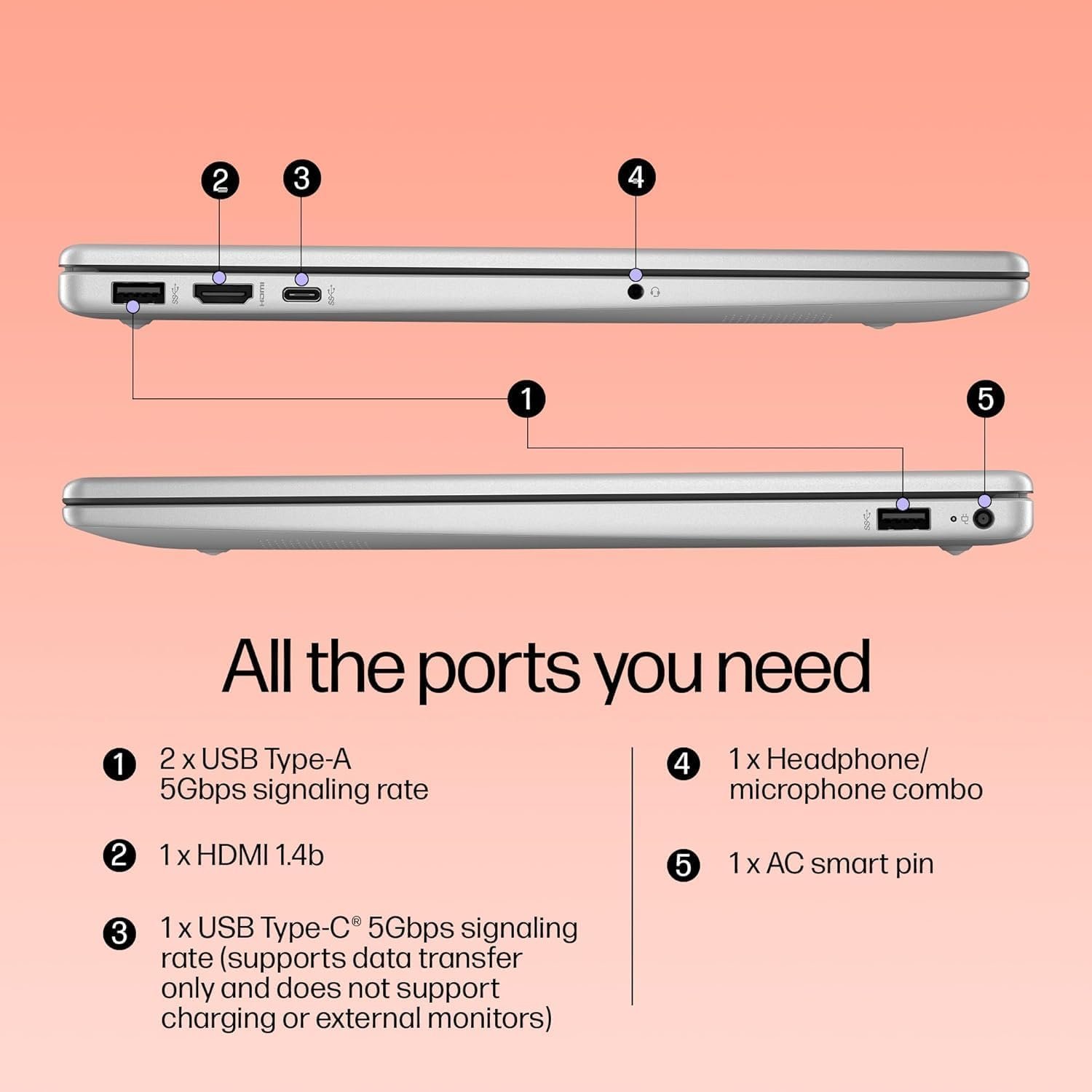 AMD Ryzen 5 processor Windows 11 Home 35.6 cm (14″) diagonal, FHD (1920 x 1080), micro-edge, anti-glare, 250 nits, 45% NTSC 8 GB DDR4-3200 MHz RAM (1 x 8 GB) 512 GB PCIe NVMe M.2 SSD Power through your day AMD Radeon Graphics 1 SuperSpeed USB Type-C 5Gbps signaling rate; 2 SuperSpeed USB Type-A 5Gbps signaling rate; 1 HDMI 1.4b; 1 AC smart pin; 1 headphone/microphone combo Up to 9 hours and 30 minutes 1 year (1/1/1) limited warranty includes 1 year of parts and labor. On-site repair. Terms and conditions vary by country. Certain restrictions and exclusions apply.