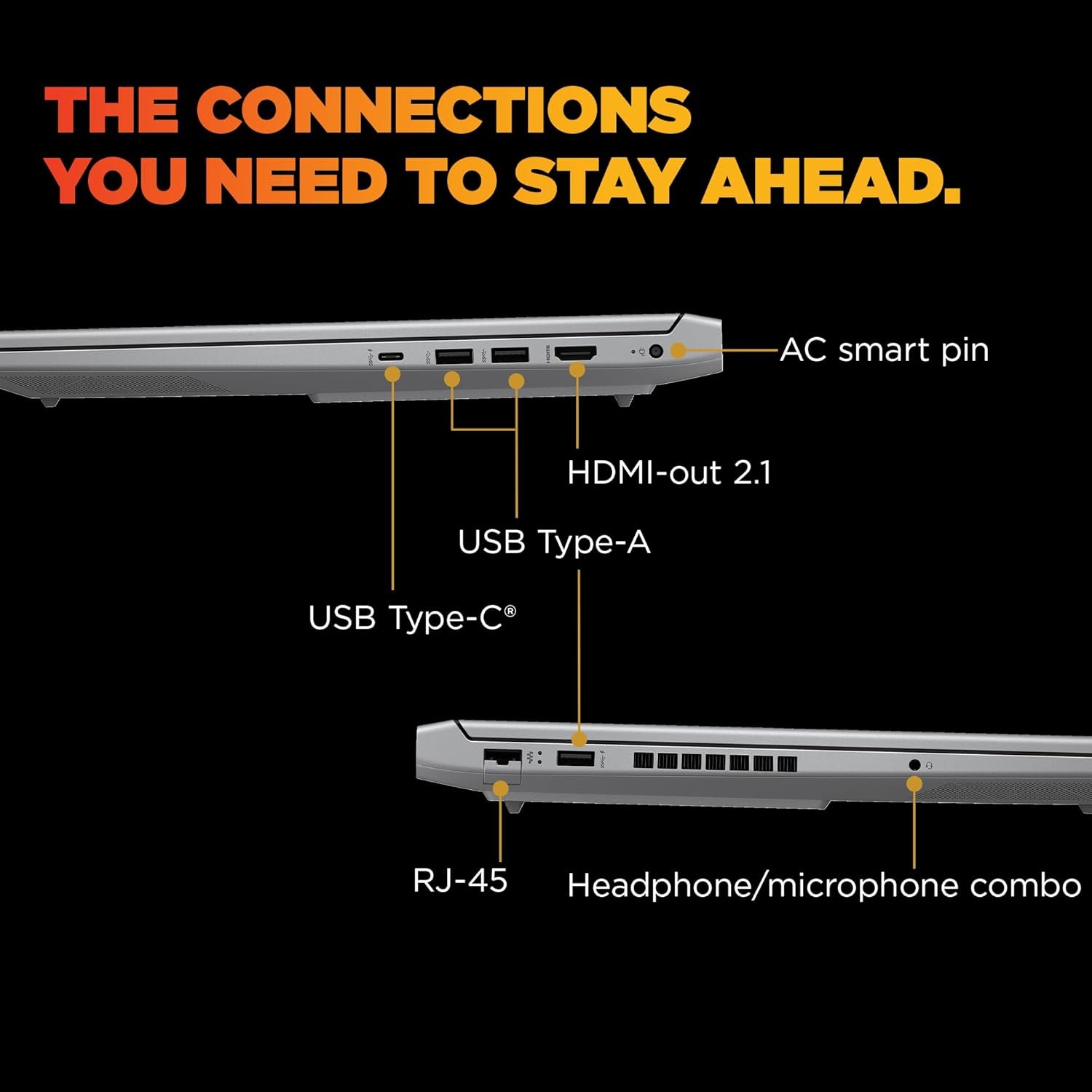 Ports & Connectivity : 1 USB Type-C 5Gbps signaling rate (USB Power Delivery, DisplayPort 1.4, HP Sleep and Charge); 2 USB Type-A 5Gbps signaling rate; 1 USB TypeA 5Gbps signaling rate (HP Sleep and Charge); 1 AC smart pin; 1 HDMI-out 2.1; 1 headphone/microphone combo; 1 RJ-45)| Wireless: Realtek Wi-Fi 6 (2×2) and Bluetooth 5.3 wireless card (supporting gigabit data rate
