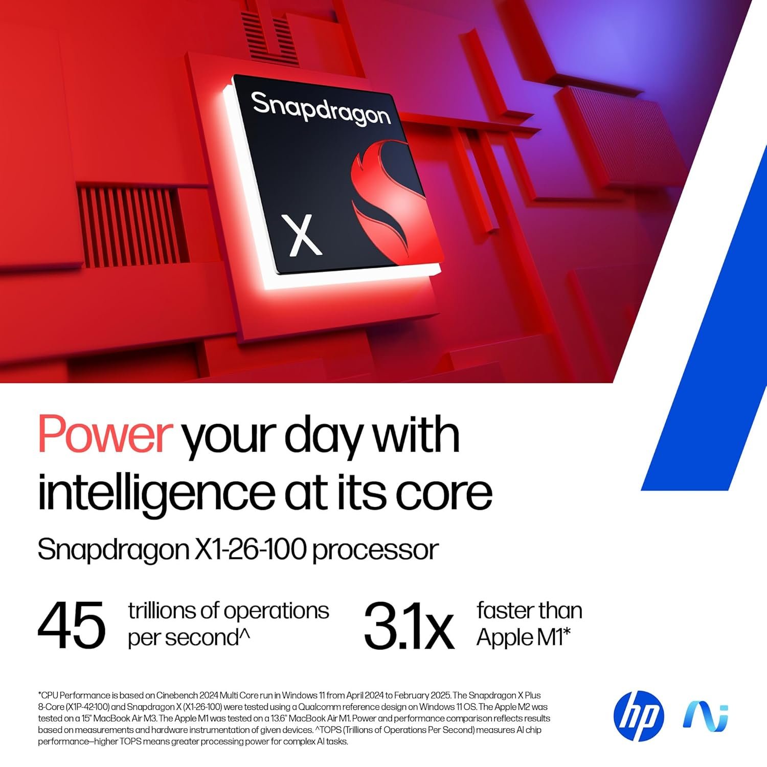Processor, Memory & Storage: QC Snapdragon X1-26-100 (up to 3GHz max boost clock, 30 MB L3 cache, 8 cores, 8 threads)| Memory: 16 GB LPDDR5x -8448 MT/s (onboard)| Storage: 1 TB PCIe Gen4 NVMe M.2 SSD