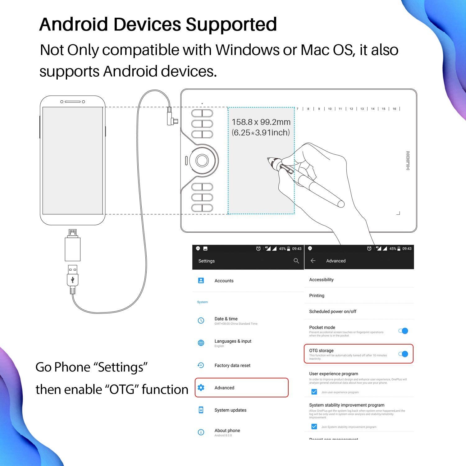Android OS Supported: HUION HS610 is compatible with Android OS 6.0 or later. You can easily connect your Android devices to the drawing pad with OTG adapter. With 8mm thickness and 600g weight, HS610 is lightweight and easy-to-carry, making it a great partner for drawing at anytime and anywhere with your phone