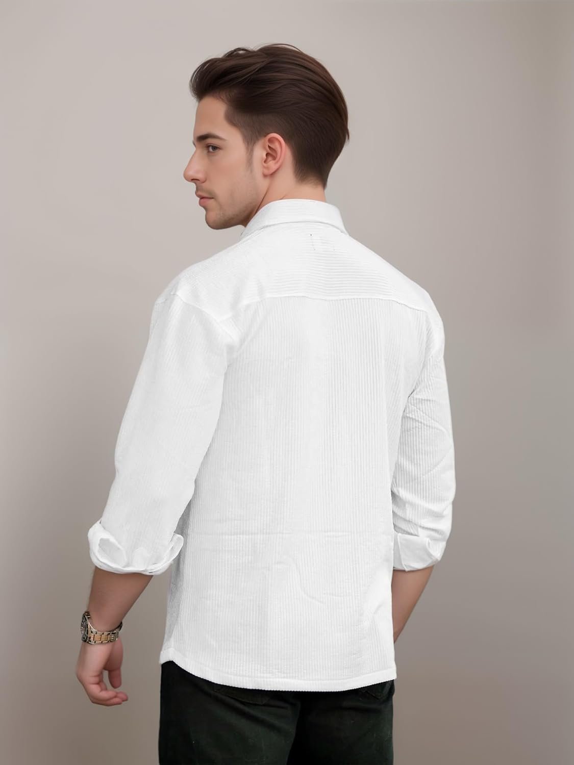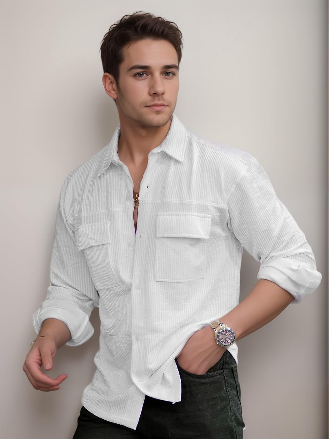 Featuring a stylish double pocket design, this shirt adds a touch of practicality and flair to your wardrobe. The chest pockets are ideal for carrying small essentials, and their elegant design enhances the overall masculine appeal of the shirt.