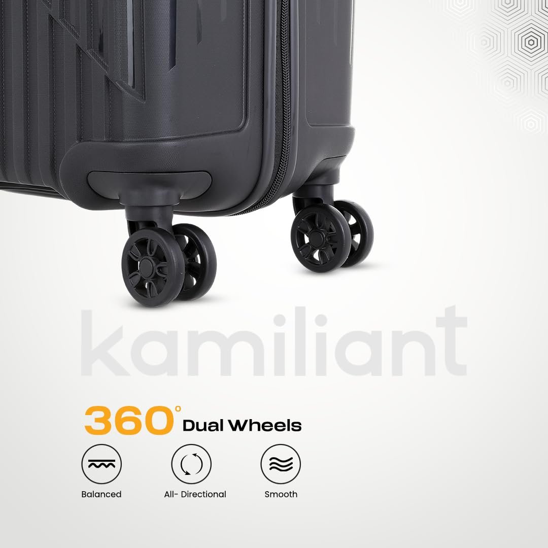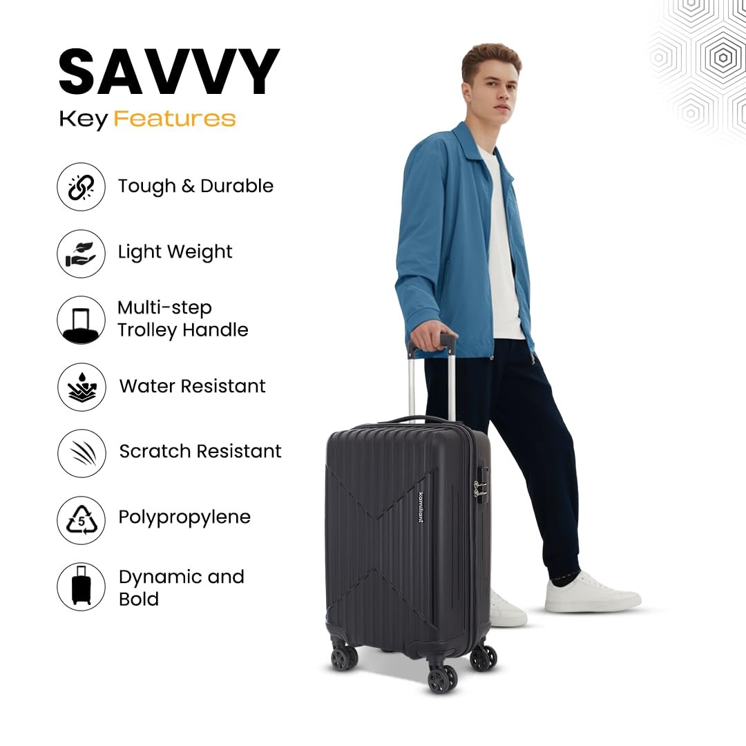 Travel in style with Kamiliant Savvy, the perfect companion for your journeys. Crafted from durable Polypropylene (PP), this premium luggage is designed to withstand the rigors of travel while maintaining a sleek, modern look. The 8 smooth-glide wheels ensure effortless mobility, while the multi-step trolley handle offers comfortable maneuvering. Keep your belongings secure with the 3-digit combination lock, providing peace of mind on every trip. Whether it’s a weekend getaway or an international adventure, Kamiliant Savvy combines elegance and functionality, making your travels seamless and stress-free.