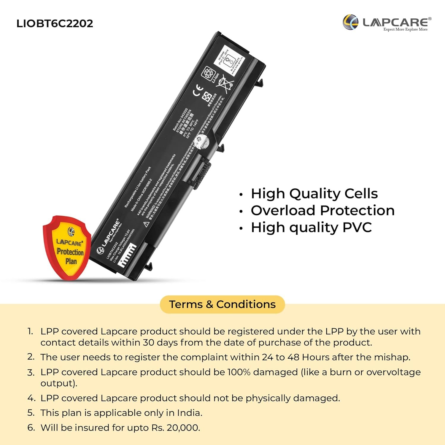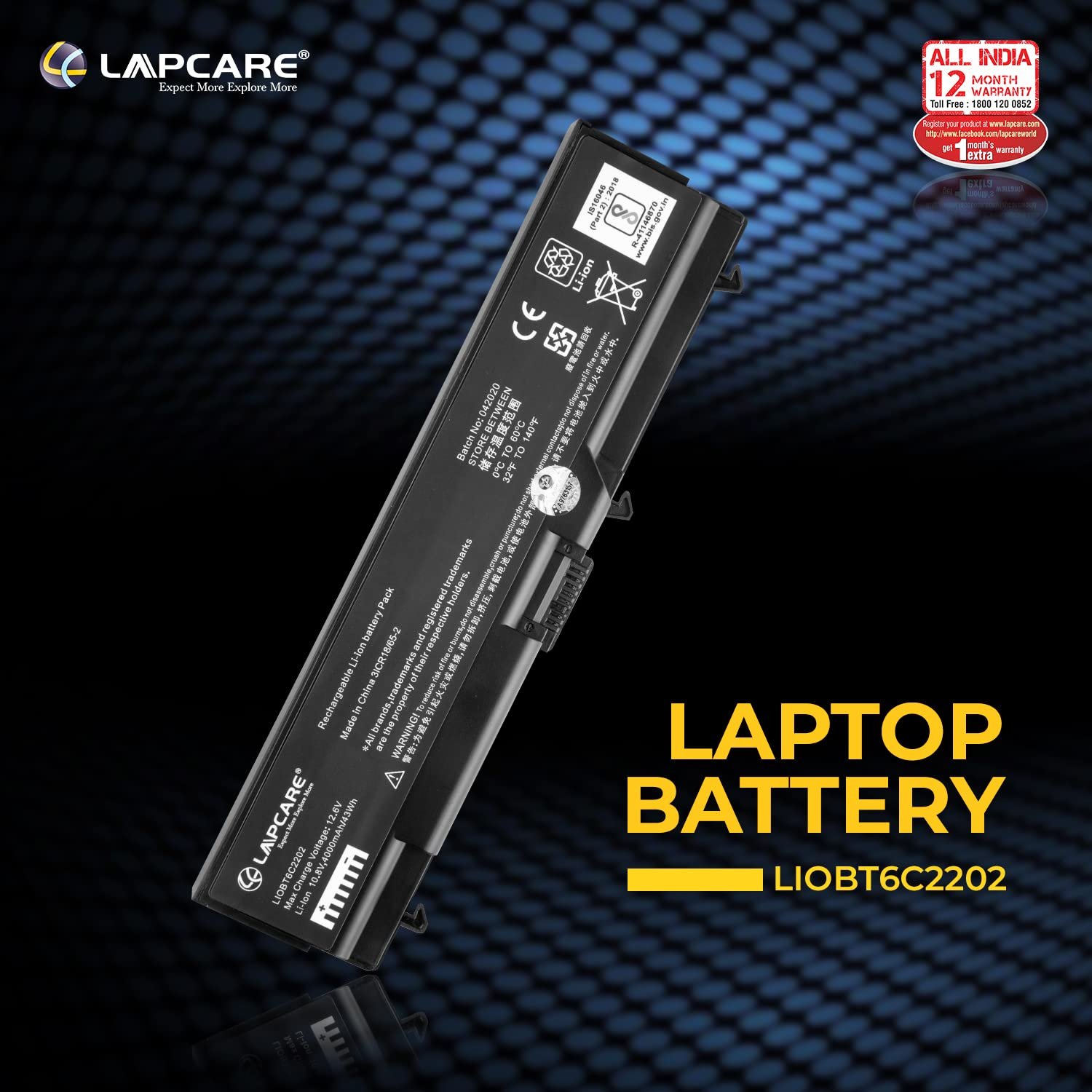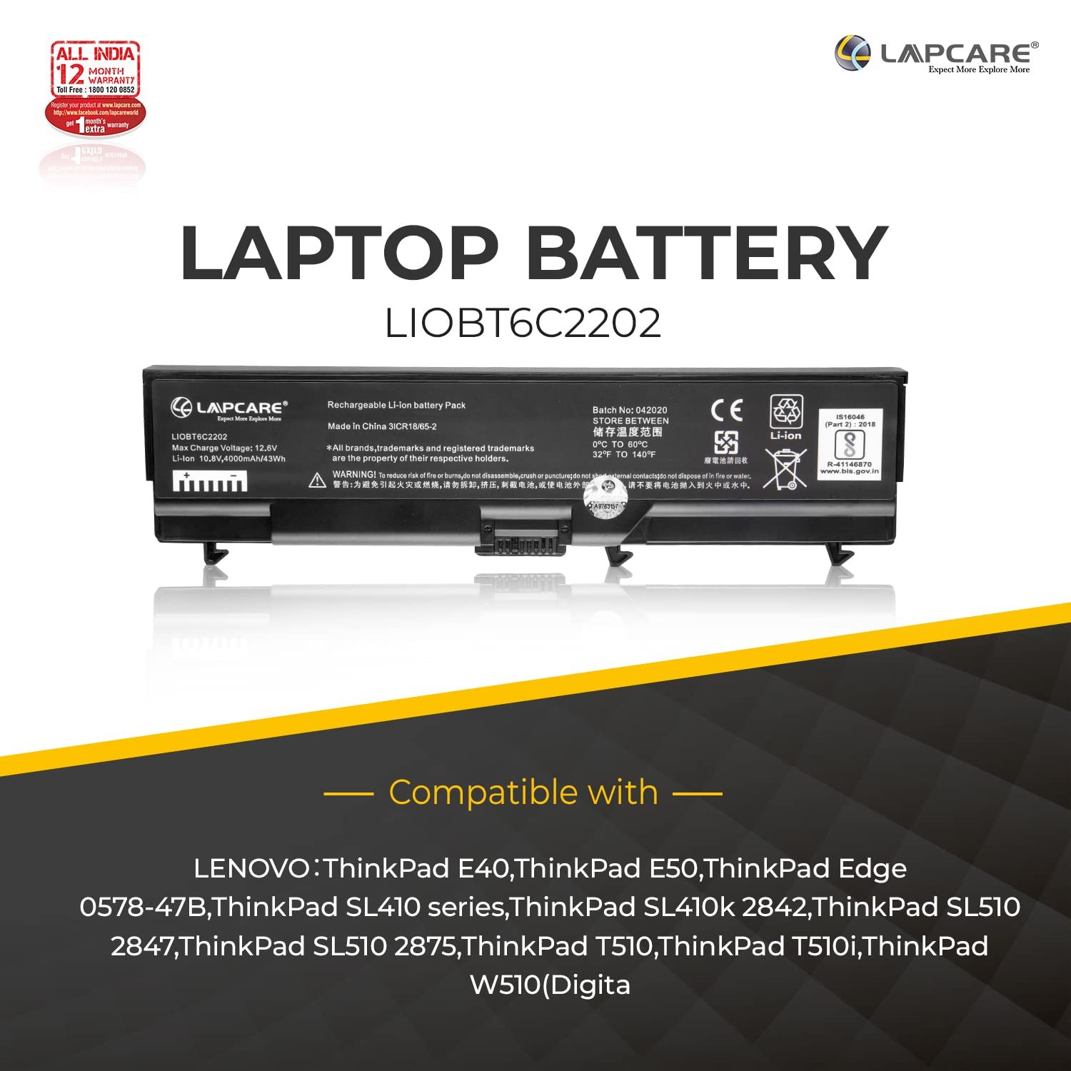 Lapcare LIOBT6C2202 battery is compatible with LENOVO:ThinkPad E40,ThinkPad E50,ThinkPad Edge 0578-47B,ThinkPad SL410 series,ThinkPad SL410k 2842,ThinkPad SL510 2847,ThinkPad SL510 2875,ThinkPad T510,ThinkPad T510i,ThinkPad W510(Digita