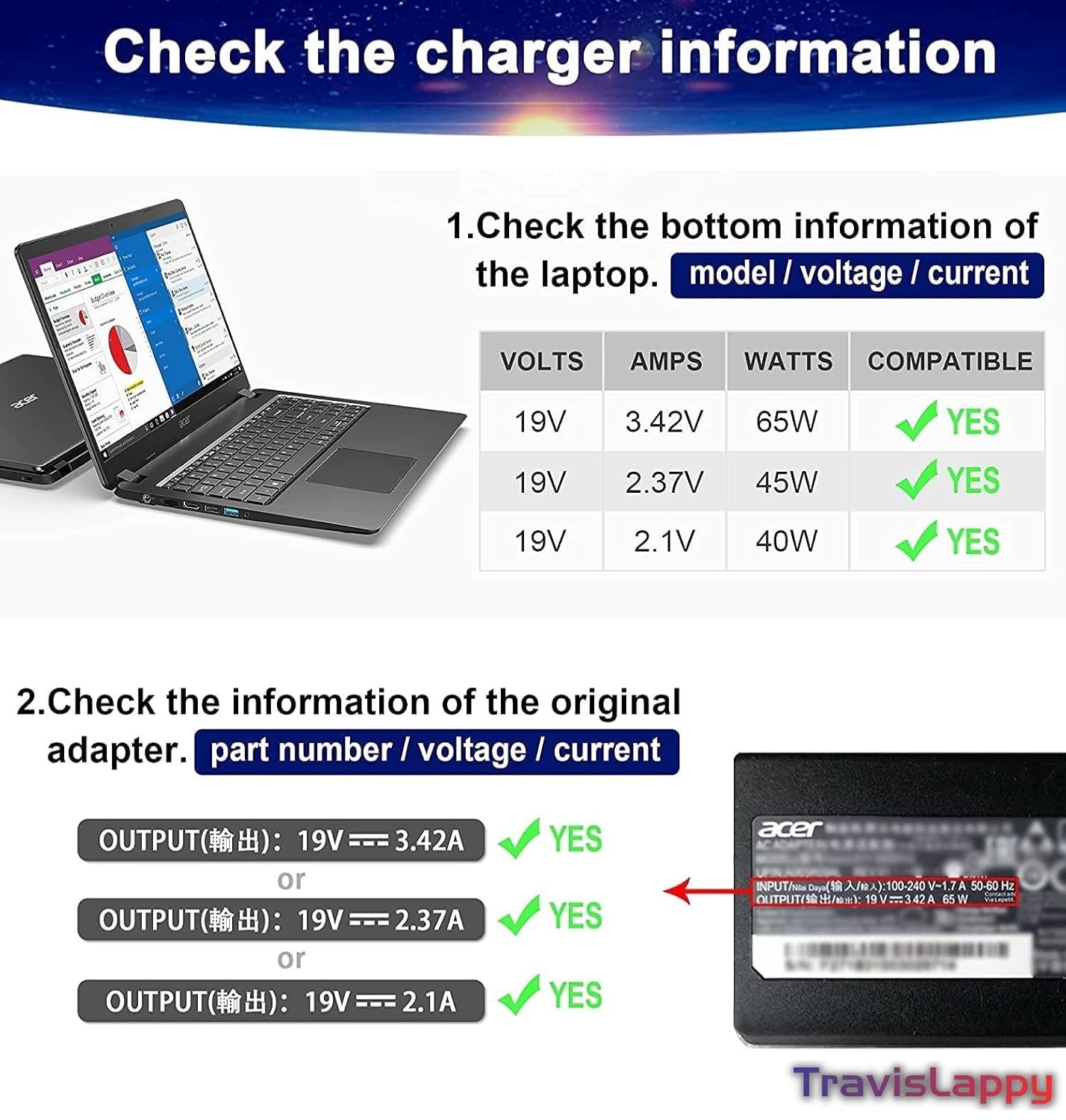 TravisLappy Laptop Charger Adapter for Acer Aspire Travelmate Extensa E1-531 19V 3.42amp 65w Adapter (Pin Size 5.5 x 1.7 mm) BIS Certified Laptop Charger Power Cord Included