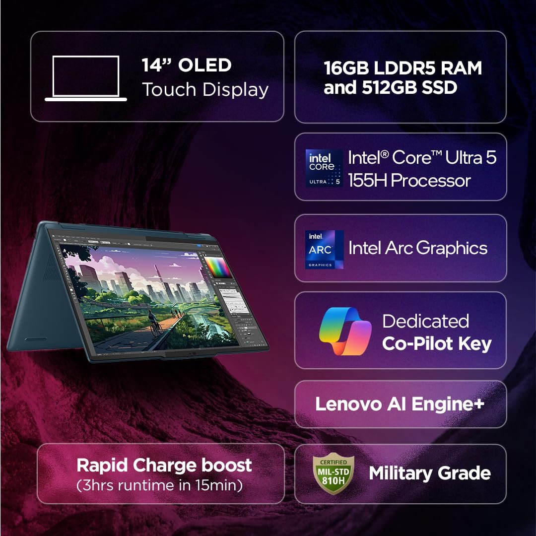 Lenovo Yoga 7 Intel Evo Core Ultra 5 125H Built in-AI 14″(35.5cm) WUXGA OLED 400Nits 2-in-1 Laptop (16GB/512GB SSD/Win 11/MSO 21/100% DCI-P3/3 Mon. Game Pass/Tidal Teal/1.5Kg), 83DJ00AKIN