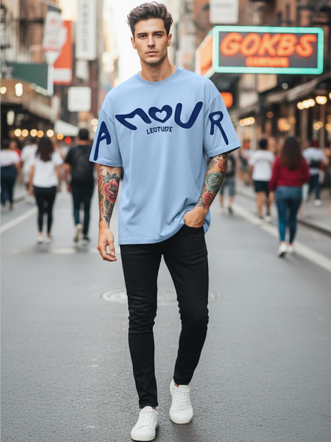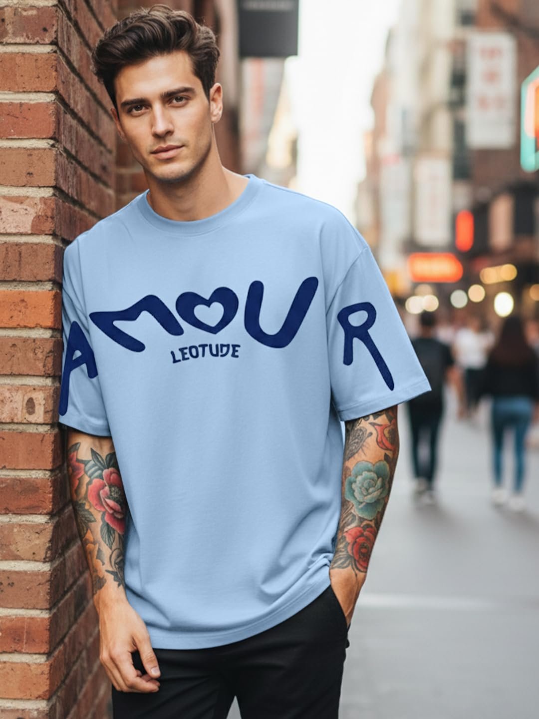 LEOTUDE Half Sleeve Cottonblend Graphic Print Round Neck Drop Shoulder Oversized Dailywear Tshirt for Man (Color Aqua Blue)