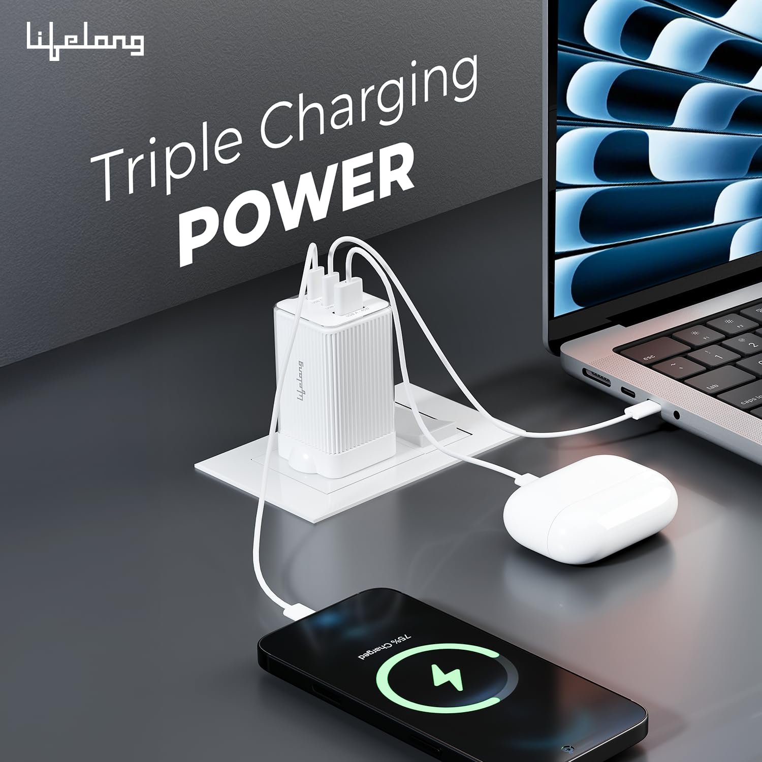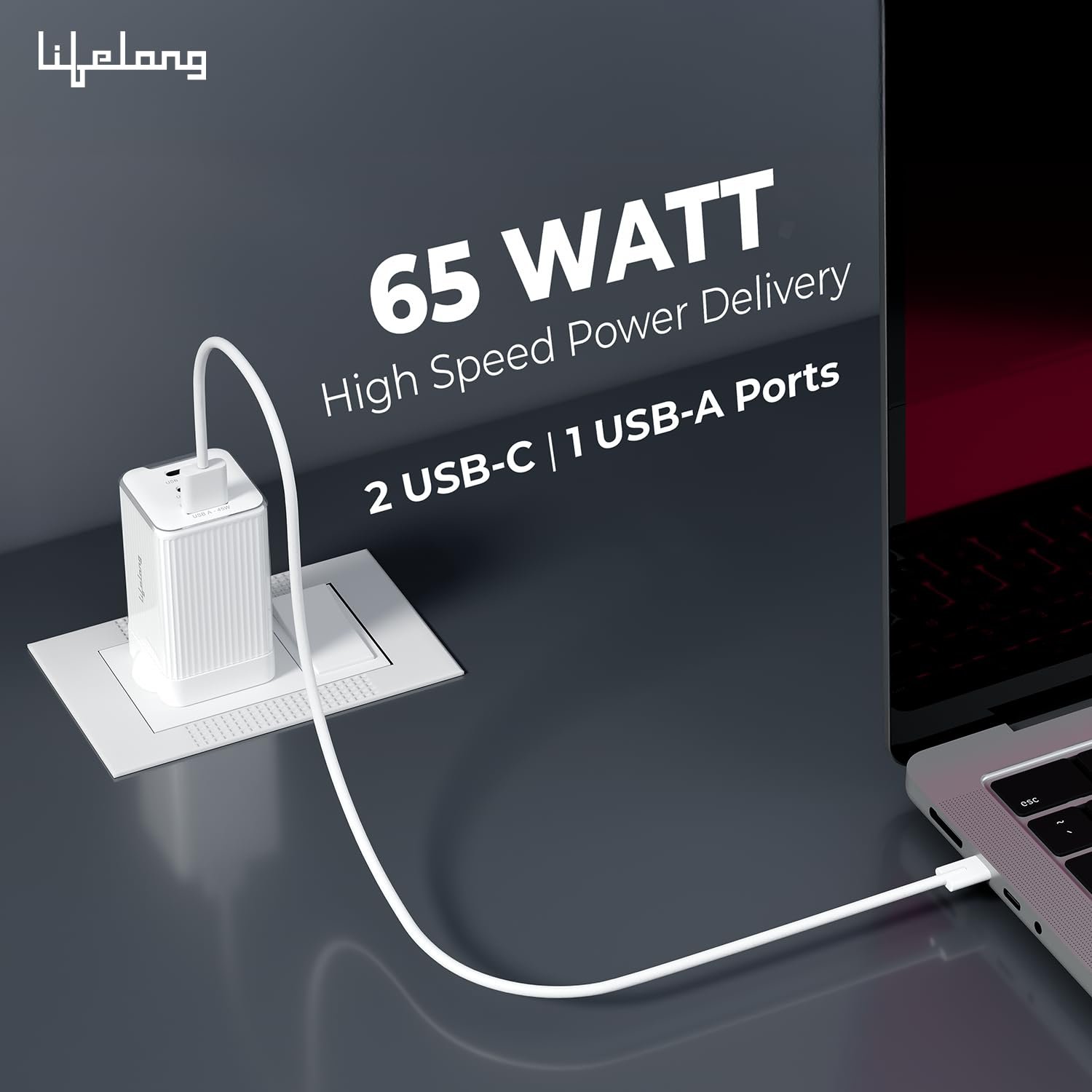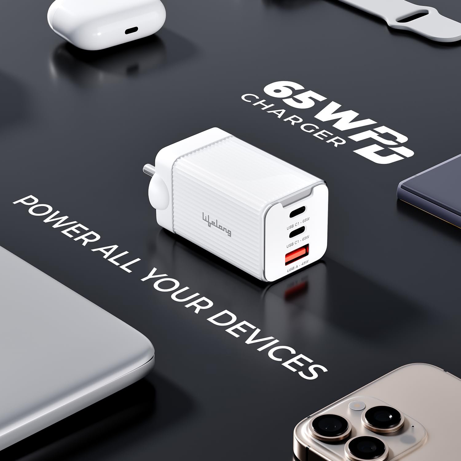 Lifelong Electronics 65W GaN Fast Charger PD Technology | 1 USB A + 2 Type C Ports | iPhone 16/15/14, Android, Samsung | Laptops – MacBook, Dell, HP, Lenovo, Acer, ASUS | BIS Certified (Glacier White)