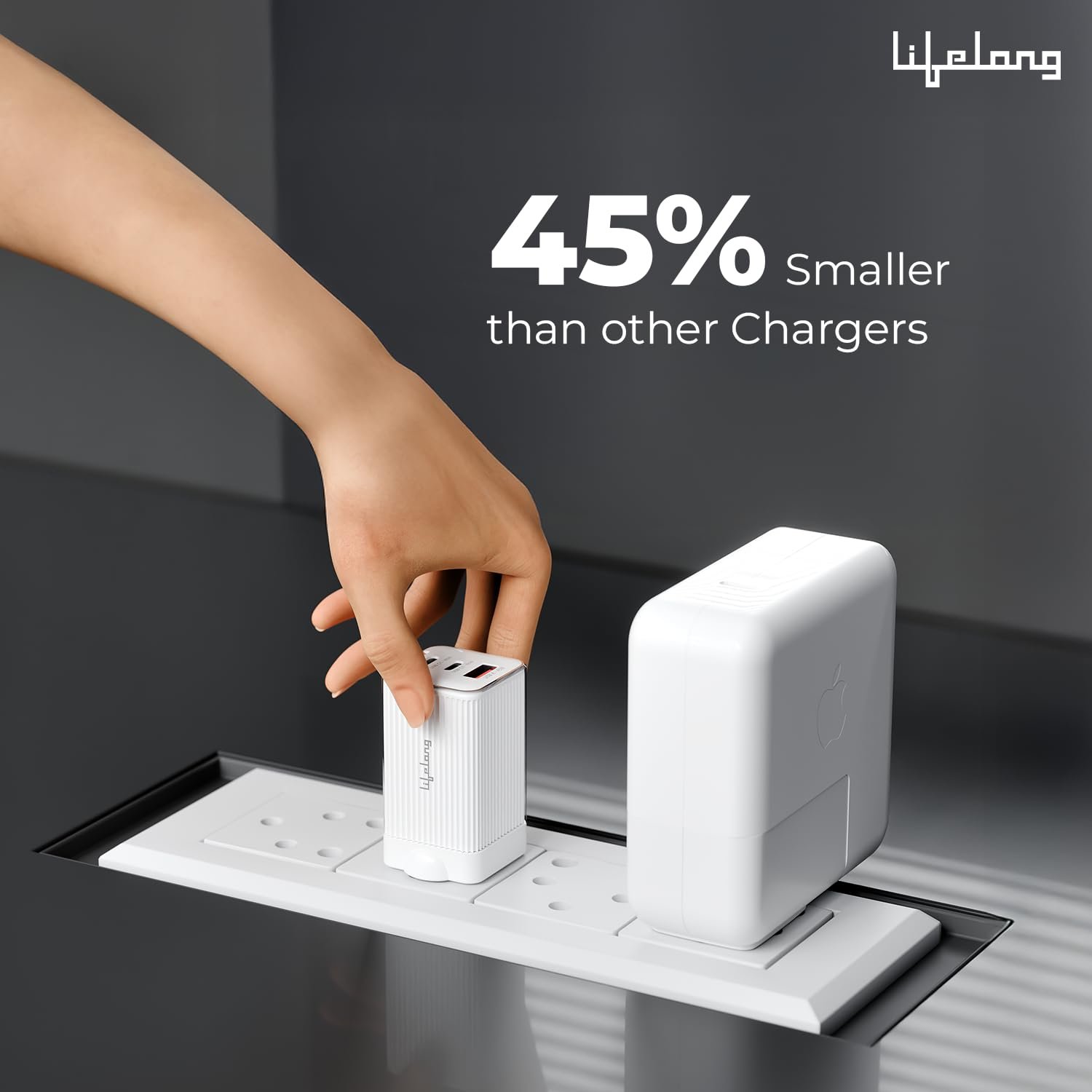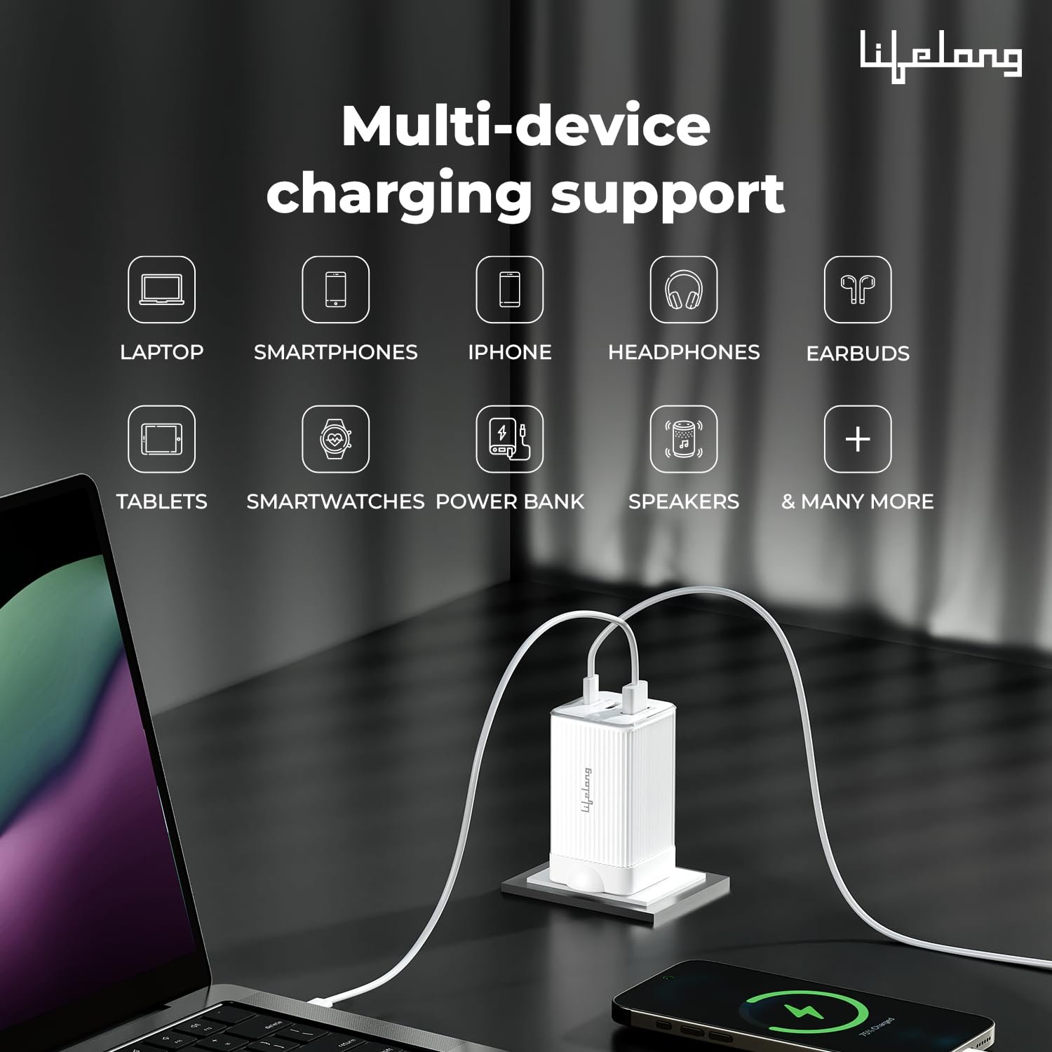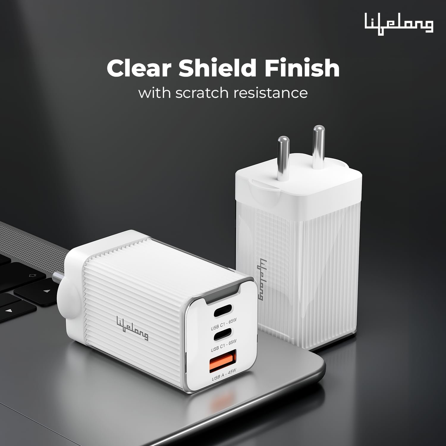 Lifelong Electronics 65W GaN Fast Charger PD Technology | 1 USB A + 2 Type C Ports | iPhone 16/15/14, Android, Samsung | Laptops – MacBook, Dell, HP, Lenovo, Acer, ASUS | BIS Certified (Glacier White)