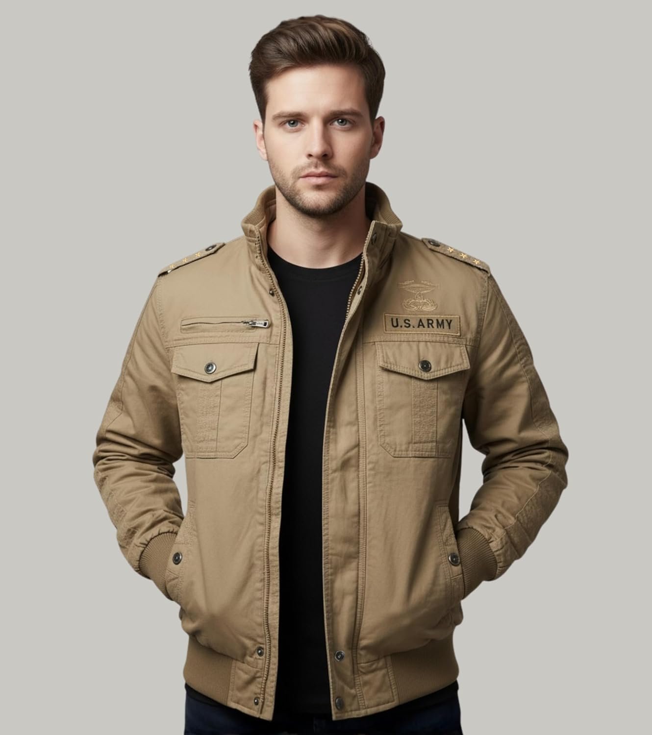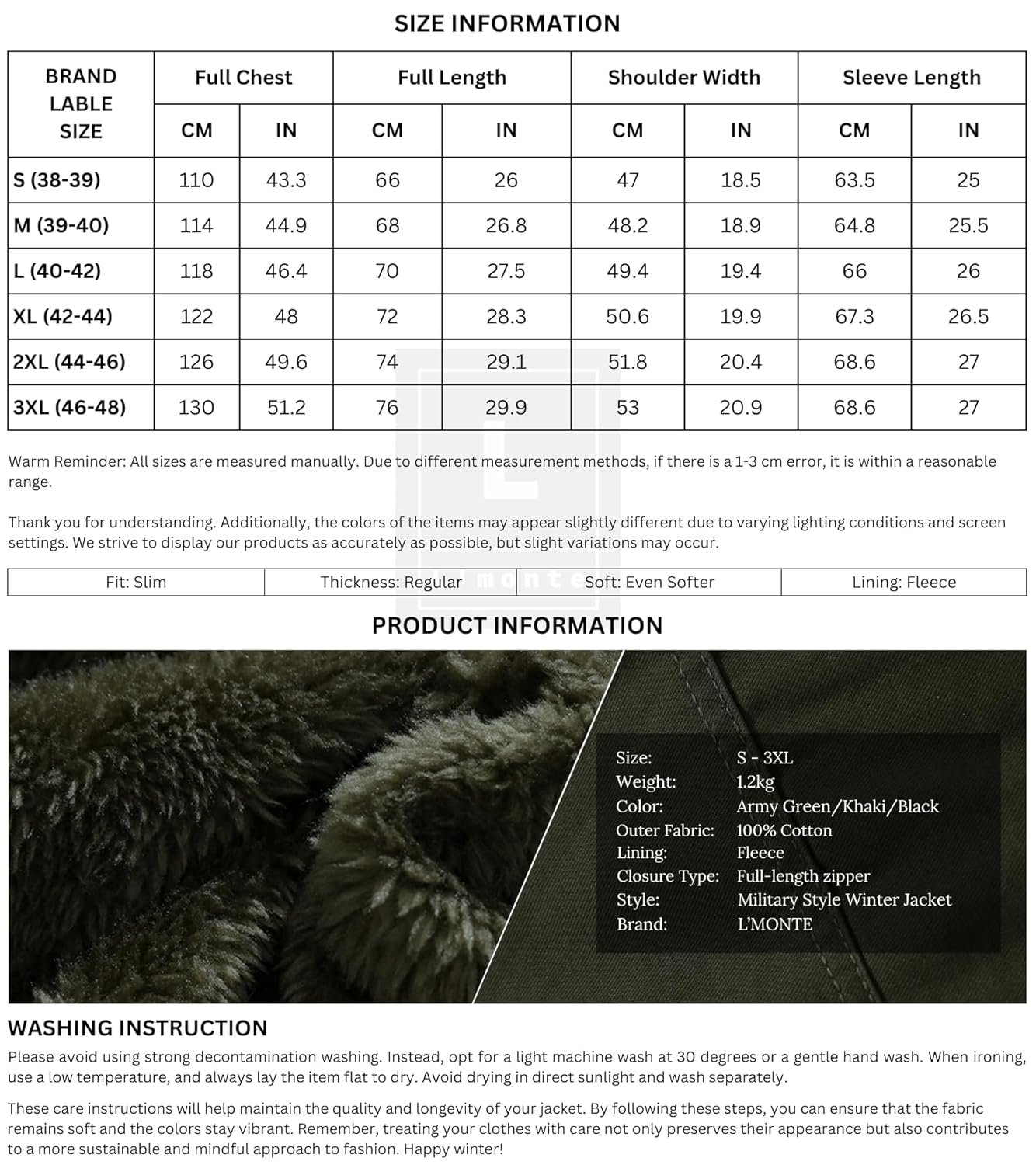 Stay warm and stylish this winter with the L’MONTE Men’s Tactical Military-Style Cotton Winter Cargo Jacket. Designed for durability and comfort, it features a 100% cotton outer shell and a soft fleece lining for superior insulation. Its military-inspired design includes shoulder epaulets, ribbed cuffs, and a stand collar, delivering both functionality and style. With five secure pockets, this jacket offers ample storage for your essentials. The windproof construction and reinforced stitching make it ideal for outdoor adventures or casual wear. Elevate your winter wardrobe with this versatile, rugged, and warm outdoor coat.
