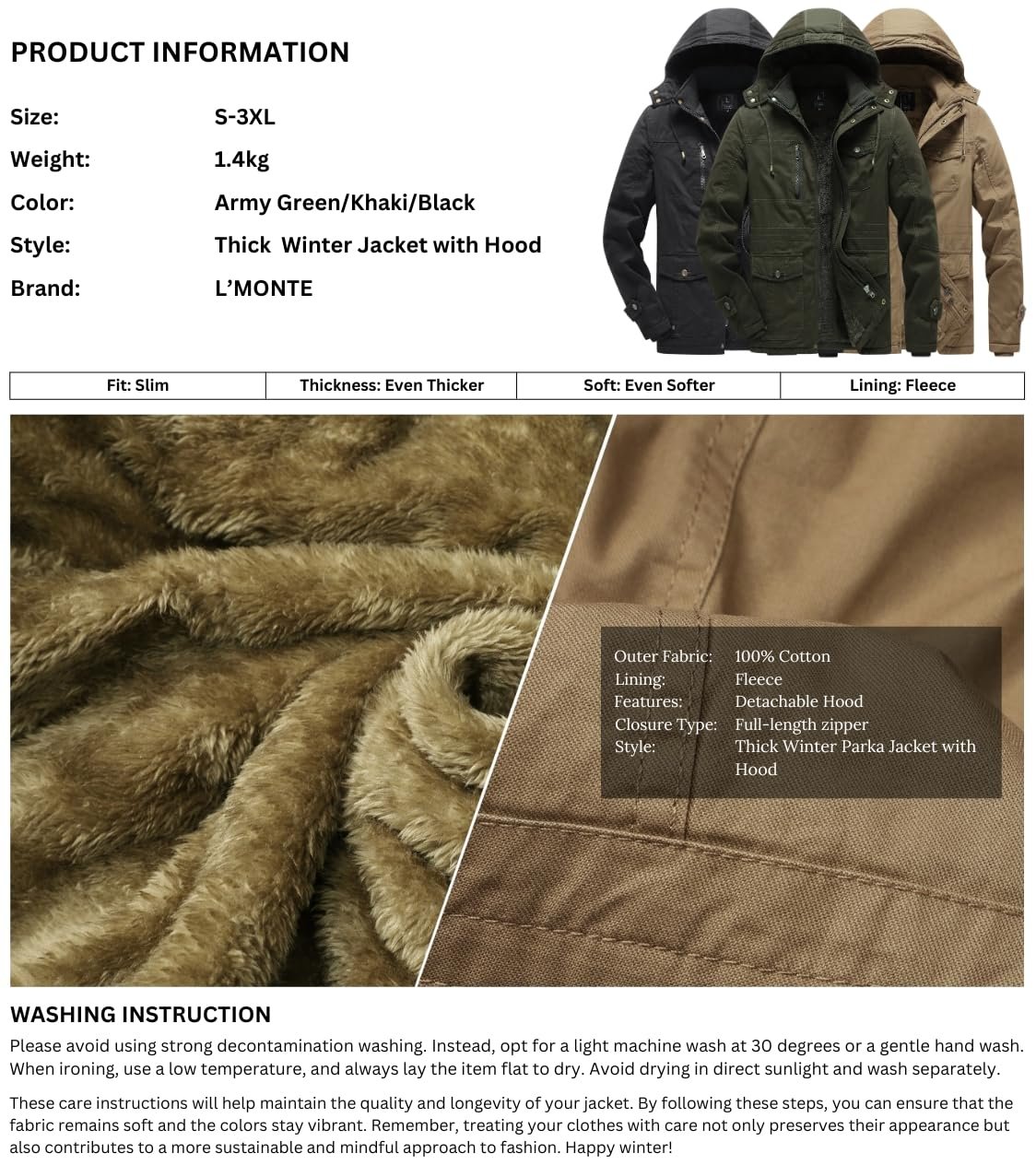 ITEM NAME: L’MONTE Men’s Winter Parka Jackets with Detachable HoodSTYLE: Soft and thick fleece lining adds insulation for increased comfort. Detachable hood with drawstring and snap button, front buttons closure, a full-length front zipper closure, and elastic cuffs for effective wind protection.COLOR: Green, Khaki & Black.JACKET FEATURES : Stand Collar with detachable hood, rib cuff, inner fleece lining & full length zipper & buttons closure.OCCASION: Excellent choice for the autumn and winter seasons. It is versatile and suitable for both formal and informal occasions, as well as outdoor sports, homes, hiking, camping, skiing, leisure, and everyday wear, offering a wide range of options.PACKAGE INCLUDING:1*Jacket