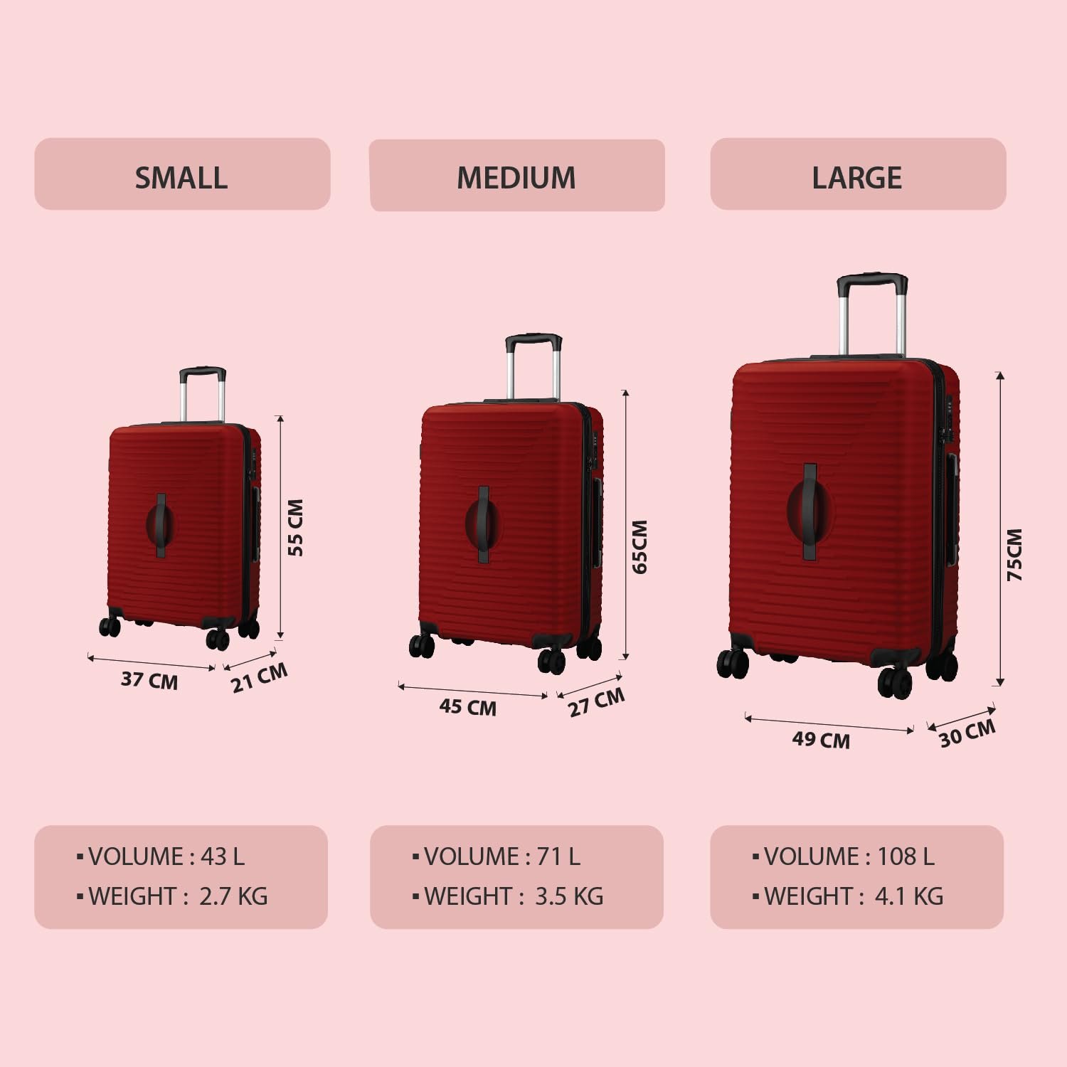 Durable and Reliable: Made from high-quality ABS material, backed by a 3-year warranty; set includes 20″ cabin bag (37x21x55 cm, 10 kg capacity) , 24″ medium bag (45x27x65 cm, 20 kg capacity) and 28″ large bag (49x30x75 cm, 25 kg capacity)