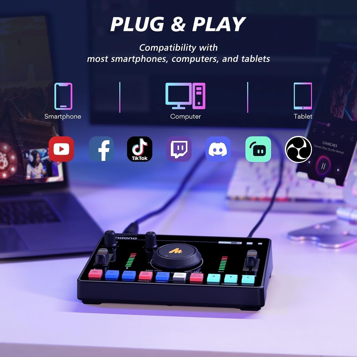 [ONE-STOP RECORDING MIXER]: Connect your mic via the XLR/6.35mm interface. Use the AUX interface to play background music from your phone. Or simply connect to a computer via the USB-C port